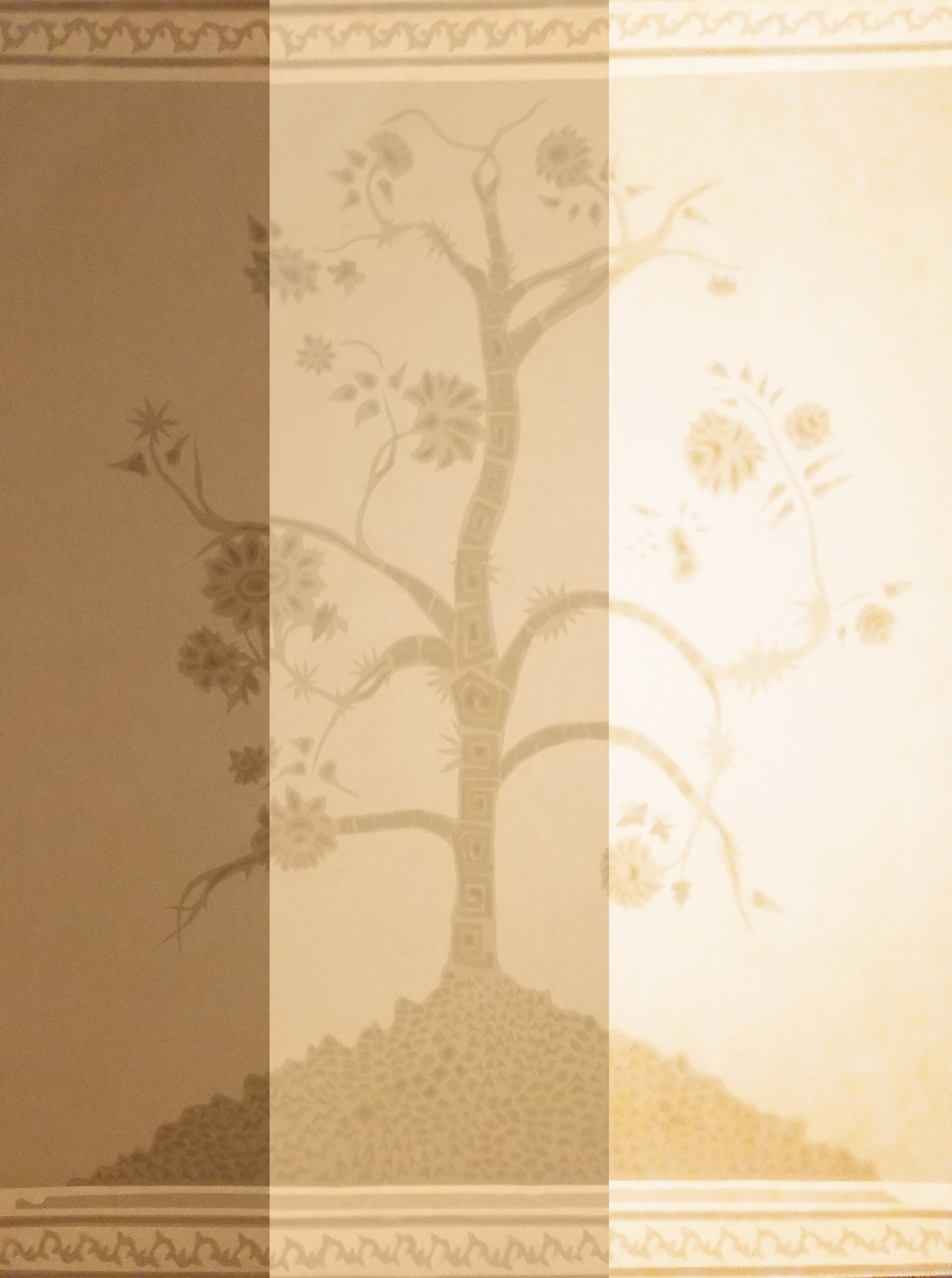 Le motif sur lequel nous avons travaillé est l’arbre sur la tapisserie de la chambre. C’est le meilleur exemple d’incrustation de motifs les uns dans les autres à la manière d’une poupée russe. Pour le mettre en exergue, nous le dévoilons par la lumière et son intensité variera en fonction de la position du spectateur par rapport à l’objet. L’interactivité est ici le moyen de révéler les différentes couches de motifs présents dans l’arbre. Notre but à travers ce travail est de mieux prendre en compte la richesse de cette tapisserie galvaudée en permettant au spectateur de s’impliquer dans le processus d’illumination.