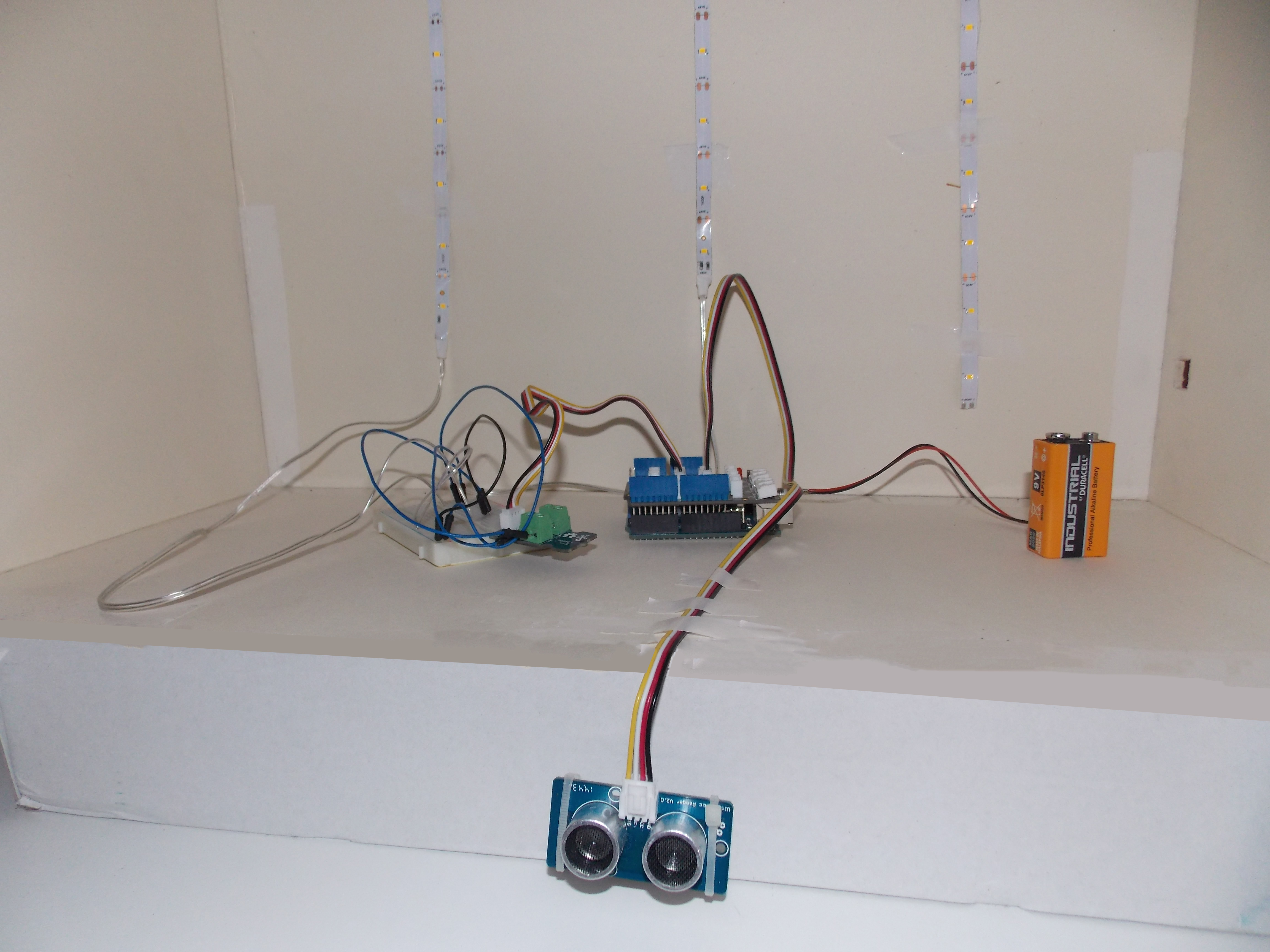 Pour pouvoir mettre en interaction le spectateur et l'intensité, un circuit arduino est nécessaire. Dans la boîte nous trouvons une carte arduino, un shield, un capteur ultrason, des bandeaux de leds, une breadboard, un module mosfet, des fils, une pile 5V. Le module Mosfet remplace la led 6 car il permet d'apporter une source d'alimentation externe comme une power bank 5V (pour éviter de pomper l'énergie utilisée par la carte via la pile 5V). Comme il y avait 2 bandeaux de led, la breadboard est nécessaire pour faire un circuit en dérivation.
