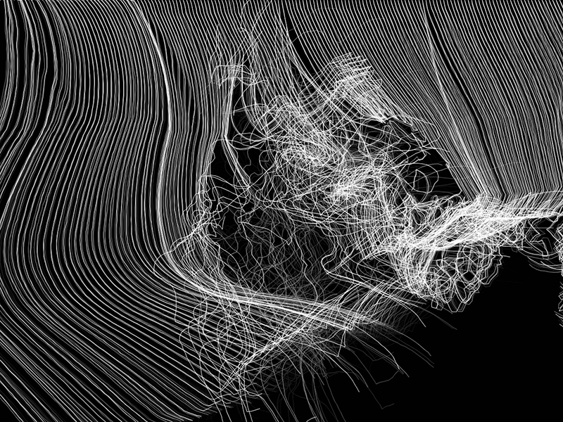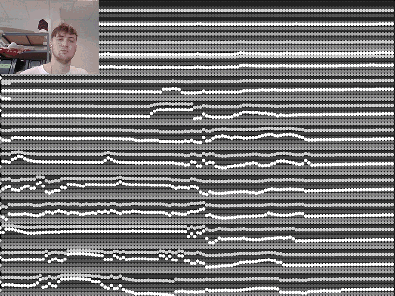 Le code processing fonctionne en trois temps importants, tout d'abord celui de la caméra, qui est affichée comme une grille de pixels ayant une valeur correspondante à la luminosité de chaque cellule sur l'écran, cette même valeur va permettre à des fils établis en rangées et divisés en sections de prendre une direction. Ensuite c'est les différents capteurs de distance qui entrent en jeu, ils changent des variables attribuées aux sons et à la luminosité du programme pour le rendre encore plus interactif. La dernière partie du programme permet de communiquer avec Arduino lorsqu'il y a plus d'une variable.