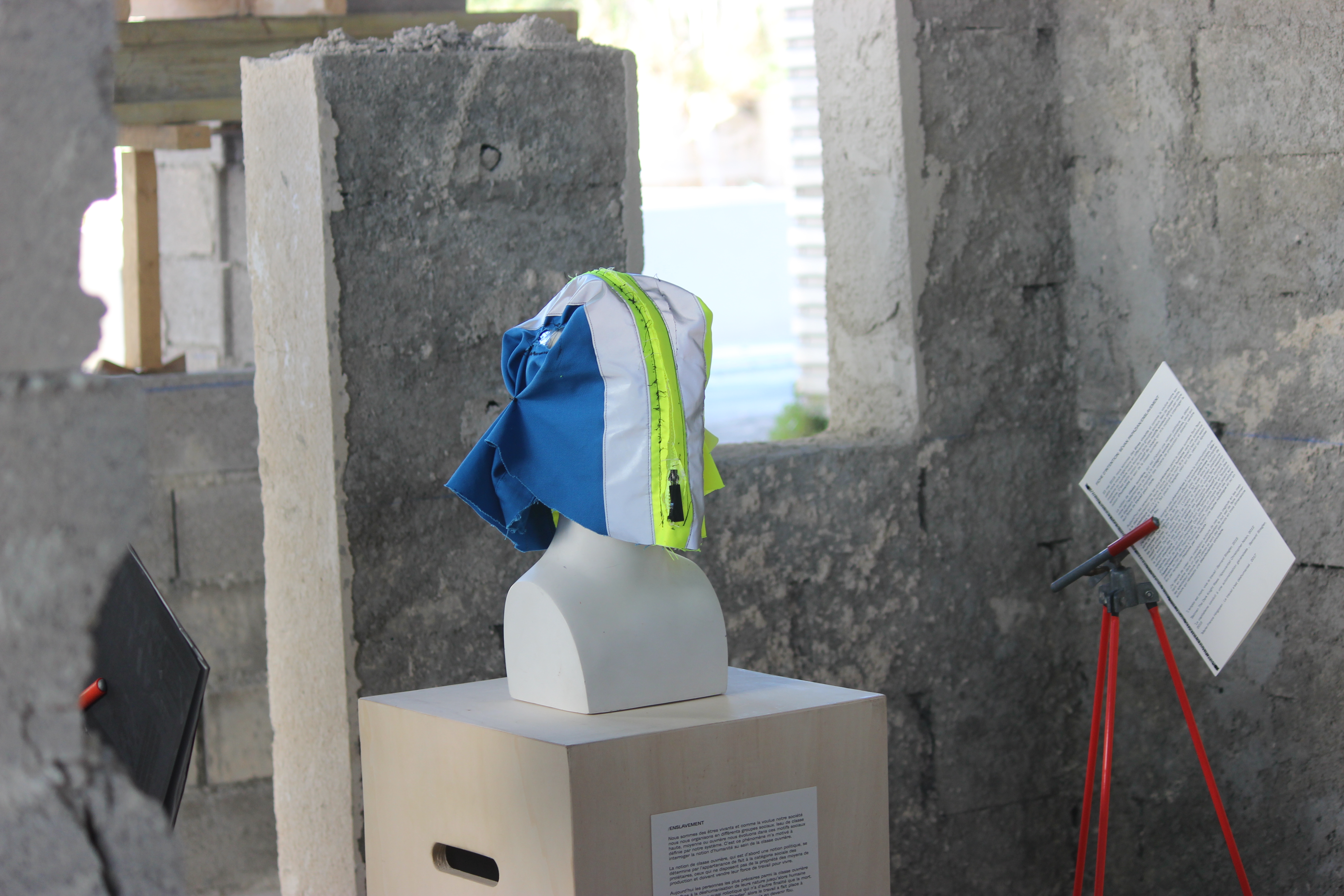 J’ai décidé de créer une installation autours de ces trois cagoule en les mettant en scène dans un paysage en construction le but est de faire tourner les spectateur autours des 3 pièces se sont des éléments en trois dimensions autours qui nécessite une déambulation circulaire*.