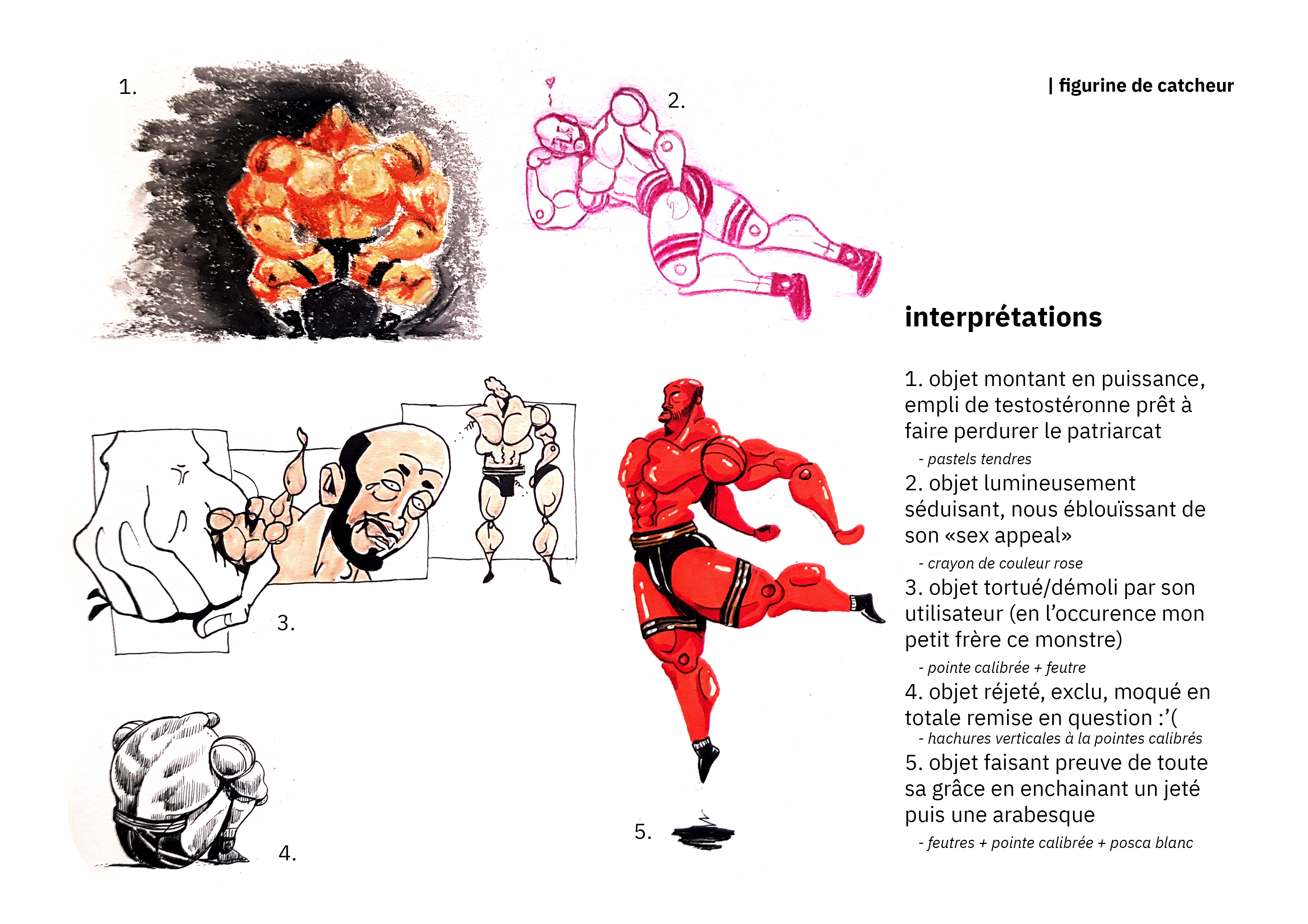 la figurine du catcheur est le personnage principale de mon histoire. Il garde son allure de jouet mais change d'apparence : musculature exagérée s'oppose à son allure androgyne.