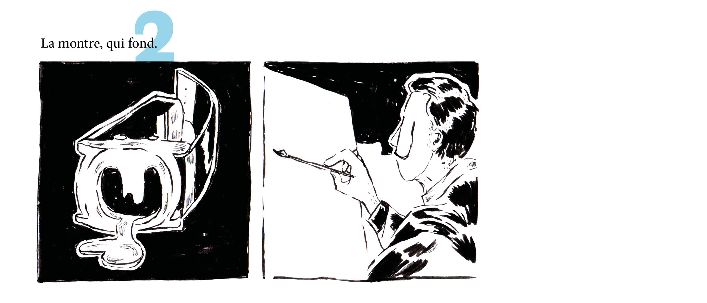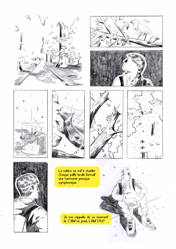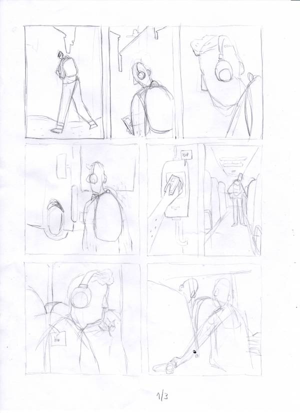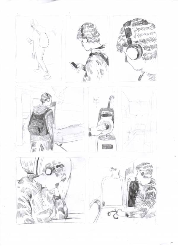 Recherche d'un style graphique pour la planche finale. Essaie au crayon.