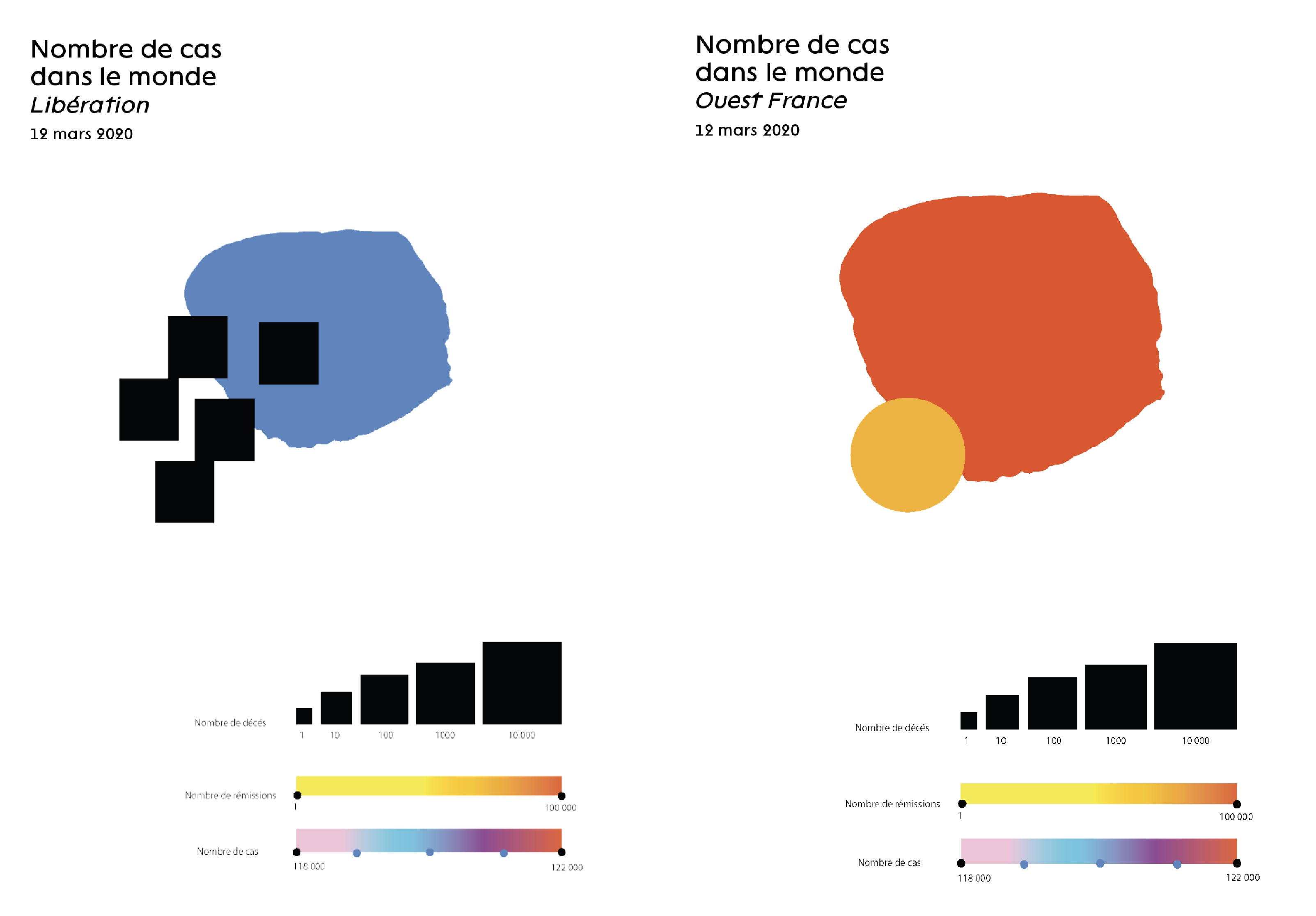 Ici, il s’agit plutôt de comparer la justesse des chiffres publiés par les journaux sur internet toujours à propos du coronavirus. Le visuel permet de représenter visuellement la précision des informations en fonction des journaux, le choix de l’outil informatique se justifie par la notion de justesse de ces informations qui se doivent impartiales et exactes.