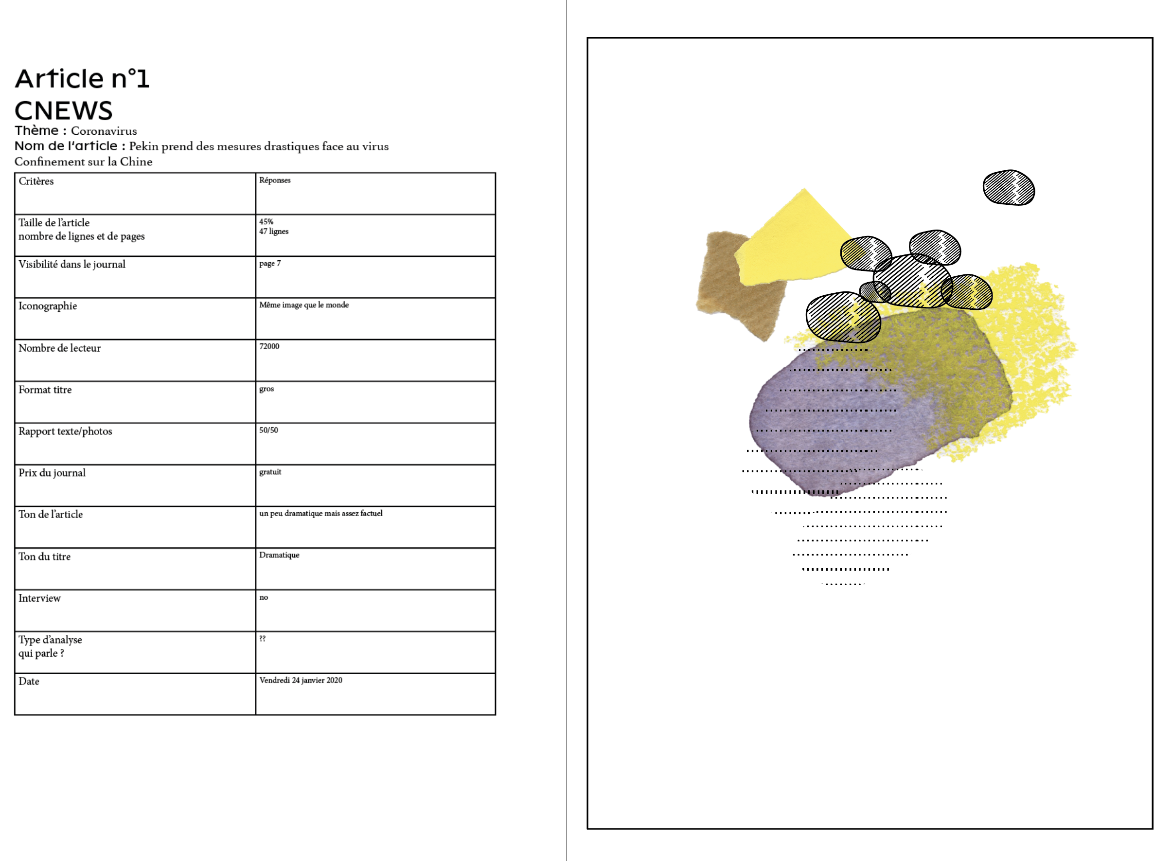 Dans une série de journaux (Le Monde, CNews, 20 minutes, l’Humanité, Libération, Aujourd’hui en France), j’ai extrait tous les articles portants sur le même sujet : le coronavirus. Je les ai ensuite comparés en fonction de la mise en page, de l’importance de l’article dans le journal, du ton, des chiffres, du ressenti du lecteur, du nombre de ligne, etc… pour arriver à une légende de plusieurs médiums (illustrator, aquarelle/craies, et papier découpé). Ensuite, en fonction des données, un visuel est créé pour chaque article.