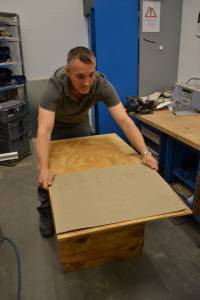 Une caisse de dimension égale à celle de Globus, couvercle ouvert soutuenu par des equerres.