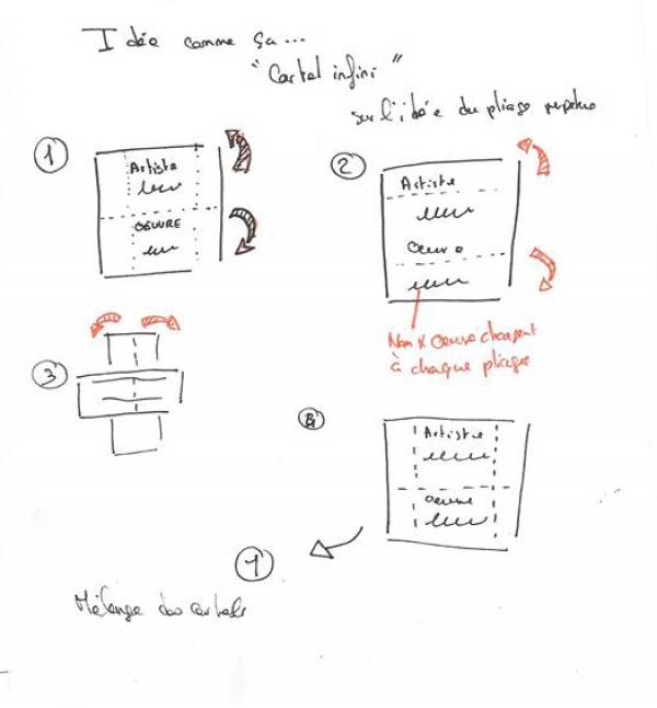 Dialogue : parole/écrit ⇒ son comme accrocheur? FP + Steph : ok pour du son (en flashs / en bribes), mais aussi avec d'autres matériaux. Donnez-nous des exemples de cartels (infos sur les formes, les matériaux, la manière de les accrocher) des précisions sur les réalisations que vous envisagez. Comment placer la médiation dans la salle ? Sans faire de l'ombre à l'œuvre ? Permutation médiation/œuvre ? faire disparaitre l'un pour mieux voir l'autre? → Lumière / ombre - Plafond / sol FP + Steph : - si vous parlez du cartel, vous aviez imaginé la production de faux cartels au recto et des vraies infos au verso / ce qui pourrait suffire à donner l'info sur l'œuvre. Donc pour nous le cartel existerait donc déjà par ce biais (qui serait suffisant) - pas de cartels sur le mur où l'œuvre est installée, mais partout ailleurs et de façon anarchique pourquoi pas ! (sol, escalier, ds l'espace….)