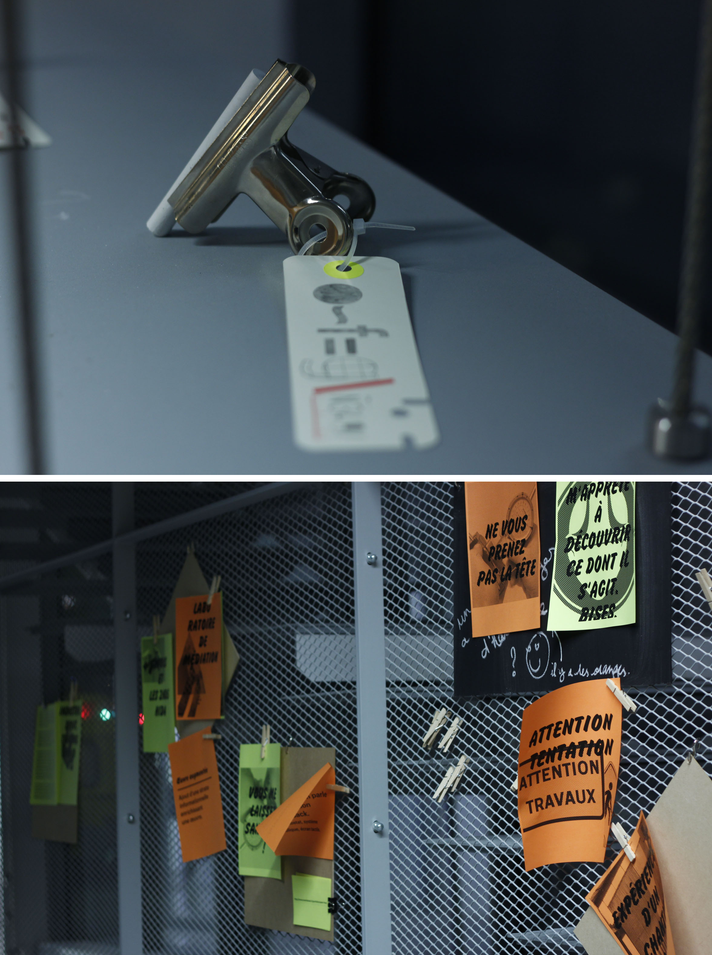 Exposition d'outils (à la manière de Marie Reinert) et de leurs étiquettes codées; Installation de l'Open Frac Generator, où les gens sont invités à venir créer leur affiche, choix du support, couleur, visuel, puis grâce à l'application mise en place par Justine, les personnes viennent inscrire un commentaire, un sentiment, un ressenti de la soirée du vernissage, ou de l'exposition de Marie Reinert. Ainsi ils viennent de créer leur affiche, celle-ci est imprimée, puis ils sont libres de la garder où de l'épingler sur les panneaux installés un peu partout dans le frac. Ainsi le lieu s'anime de nombreux ressentis.
