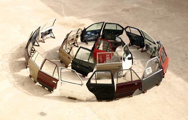 Spiral of Fez de la série « 3 R’S », juillet 2008 Installation composée de 26 portières de voitures disposées en spirales avec inscription gravées sur les vitres. Métal, verre