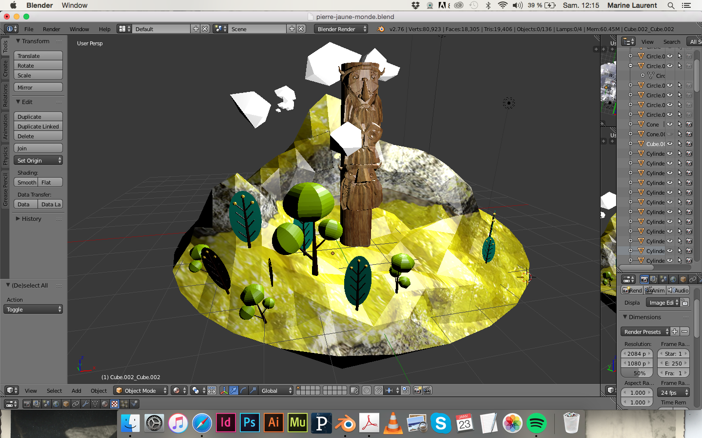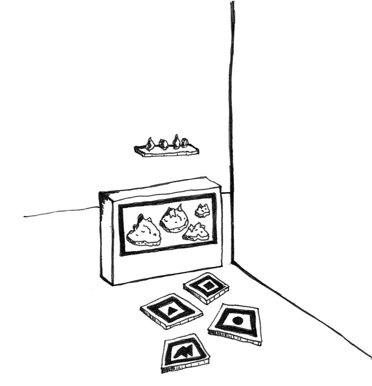 À partir des couleurs de chacune des pierres - Cyan, Magenta, Jaune, Noir - nous allons créer un petit monde tel qu'un petit cabinet de curiosité portatif, pour chacune des quatre pierres. Les mondes apparaissent en réalité augmentée grâce à des marqueurs de grande taille posés au sol. Chacun de ces mondes est unique, il possède des caractéristiques propres à la pierre, créant ainsi un véritable univers vivant pour chacune des pierres. Pour recréer numériquement la texture et la forme des pierres, nous pensons utiliser la technique de la photogrammétrie*, permettant d'obtenir un modèle 3D d'une surface ou d'un volume. Les données obtenues seront ré-exploitées pour concevoir les mondes en 3D sur Blender.