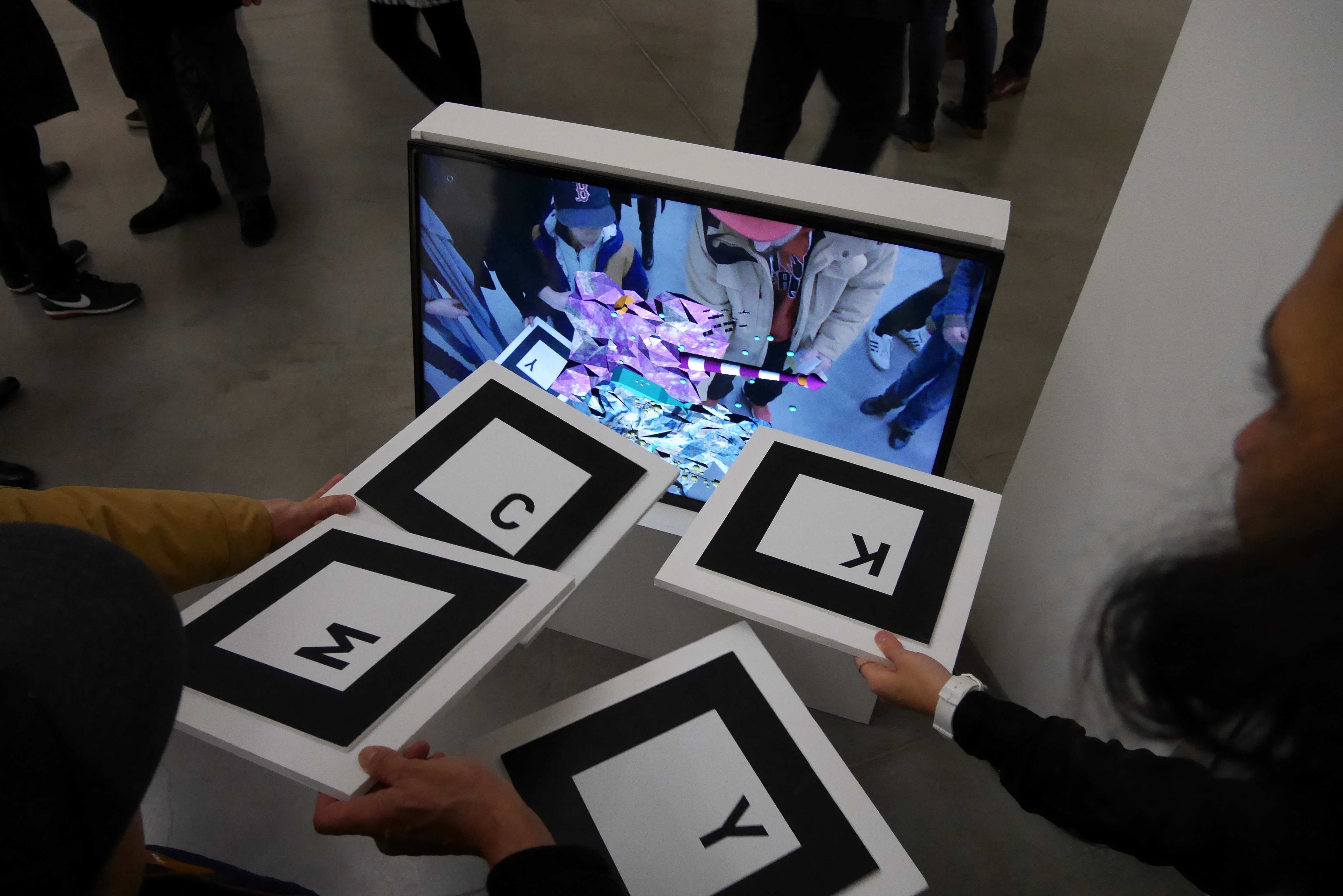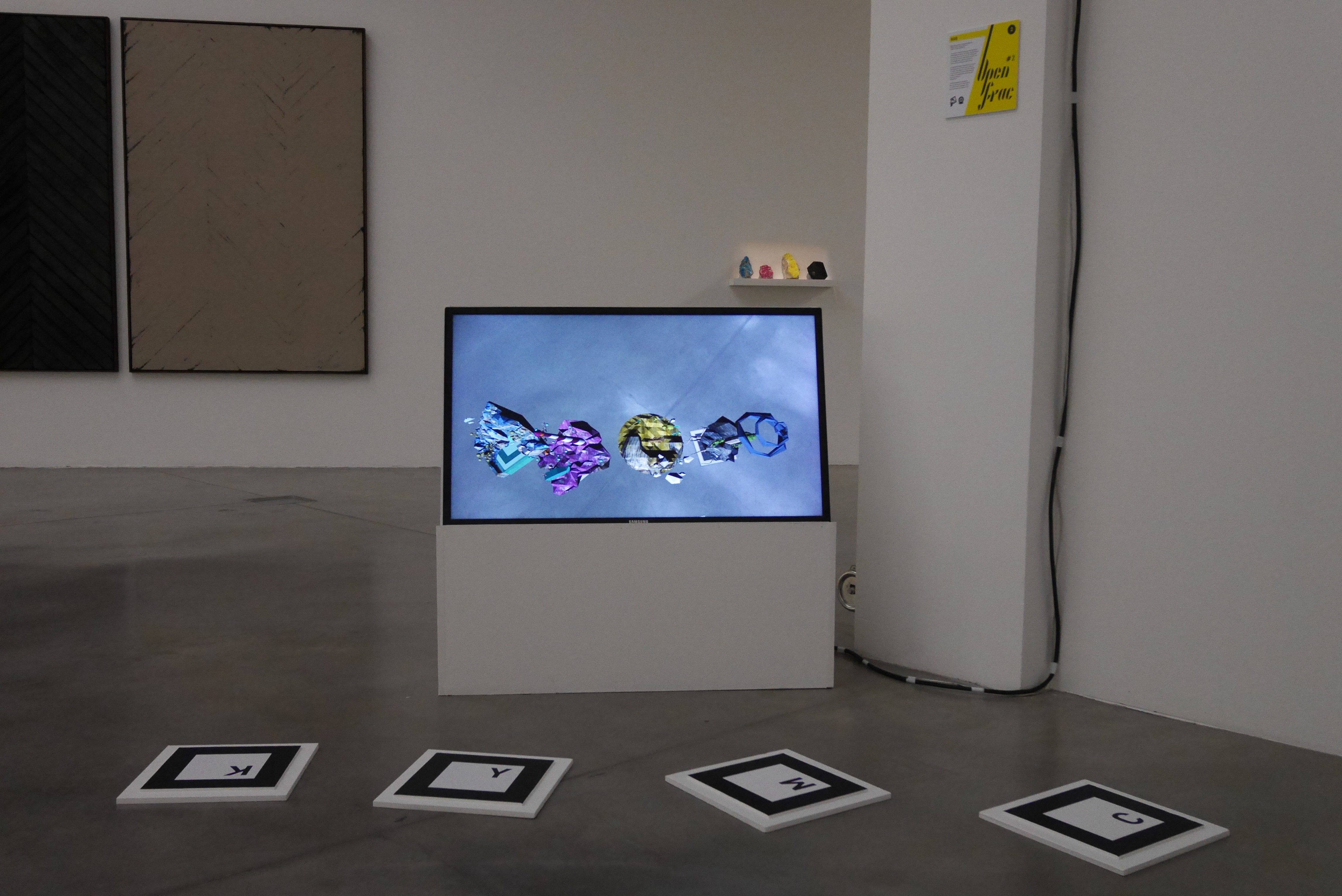 L’artiste Evariste Richer part du principe que tous les éléments avaient déjà été inventés par la nature avant l’homme et que celui-ci se les réapproprie pour les classifier. Le propos de l’artiste est illustré dans l’œuvre CMYK. Il a utilisé ces pierres semi-précieuses pour représenter le monde de l’imprimerie et sa hiérarchie des couleurs. On a observé une seconde thématique dans l’œuvre : celle de la lenteur des éléments confrontée à l’immédiateté de l’image. à partir de ces deux approches et de la technique associée nous avons pu mettre en place une médiation réalisée en réalité augmentée. à chaque pierre colorée nous avons créé un petit monde faisant référence à sa caractéristique identitaire, symbolique (ex: pierre rose = monde aquatique). Les mondes apparaissent en réalité augmentée grâce à des marqueurs de grande taille disposés au sol, grâce à un programme sur le logiciel processing, la webcam reconnaît les marqueurs et génère la réalité augmentée sur un écran de télévision. Nous avons voulu ré-exploiter la texture des pierres dans nos mondes miniatures. Ceux-ci ont été modélisés sur le logiciel 3D blender. Notre installation a été établie de manière parallèle à l’œuvre pour garder un contact direct avec celle-ci tout en invitant à s’y plonger davantage.