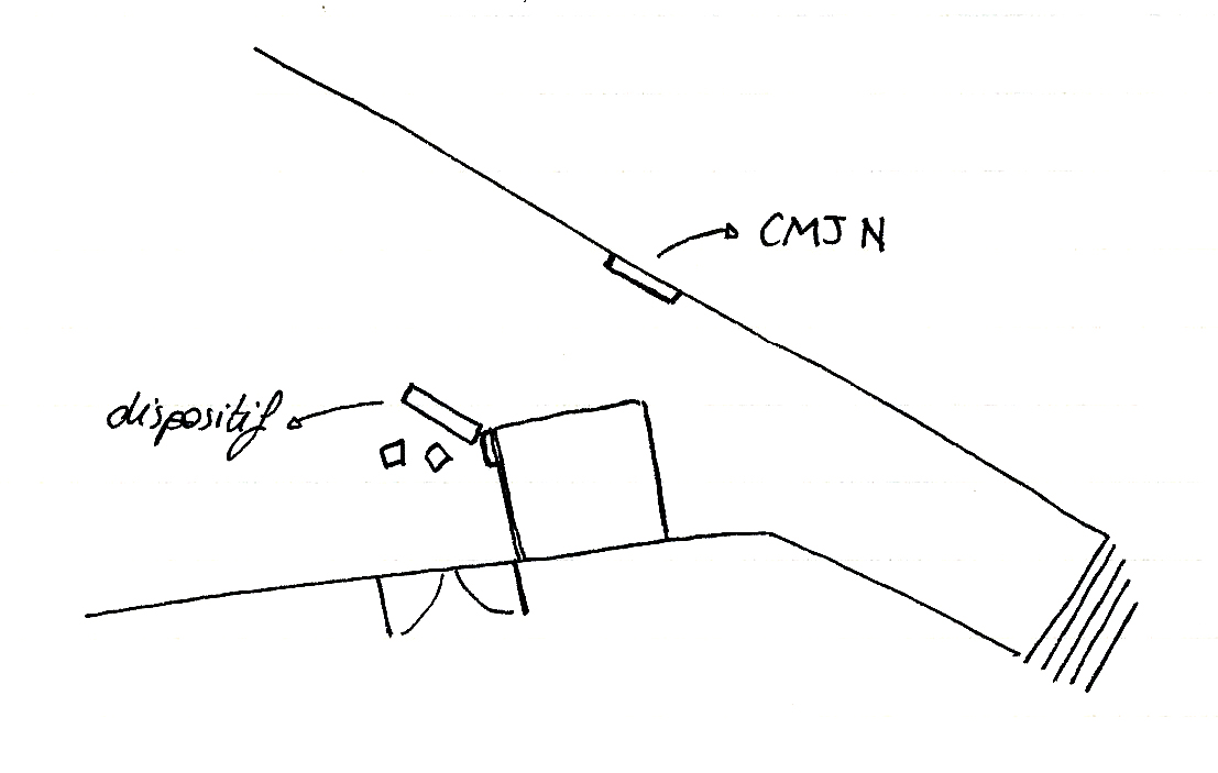 Installation : positionnement de l'augmentation face à l'installation tout en gardant une distance et donc un passage pour les gens. Cet emplacement permet de voir l’œuvre tout en regardant l'écran et en ayant une plus grande place pour la manipulation des marqueurs.