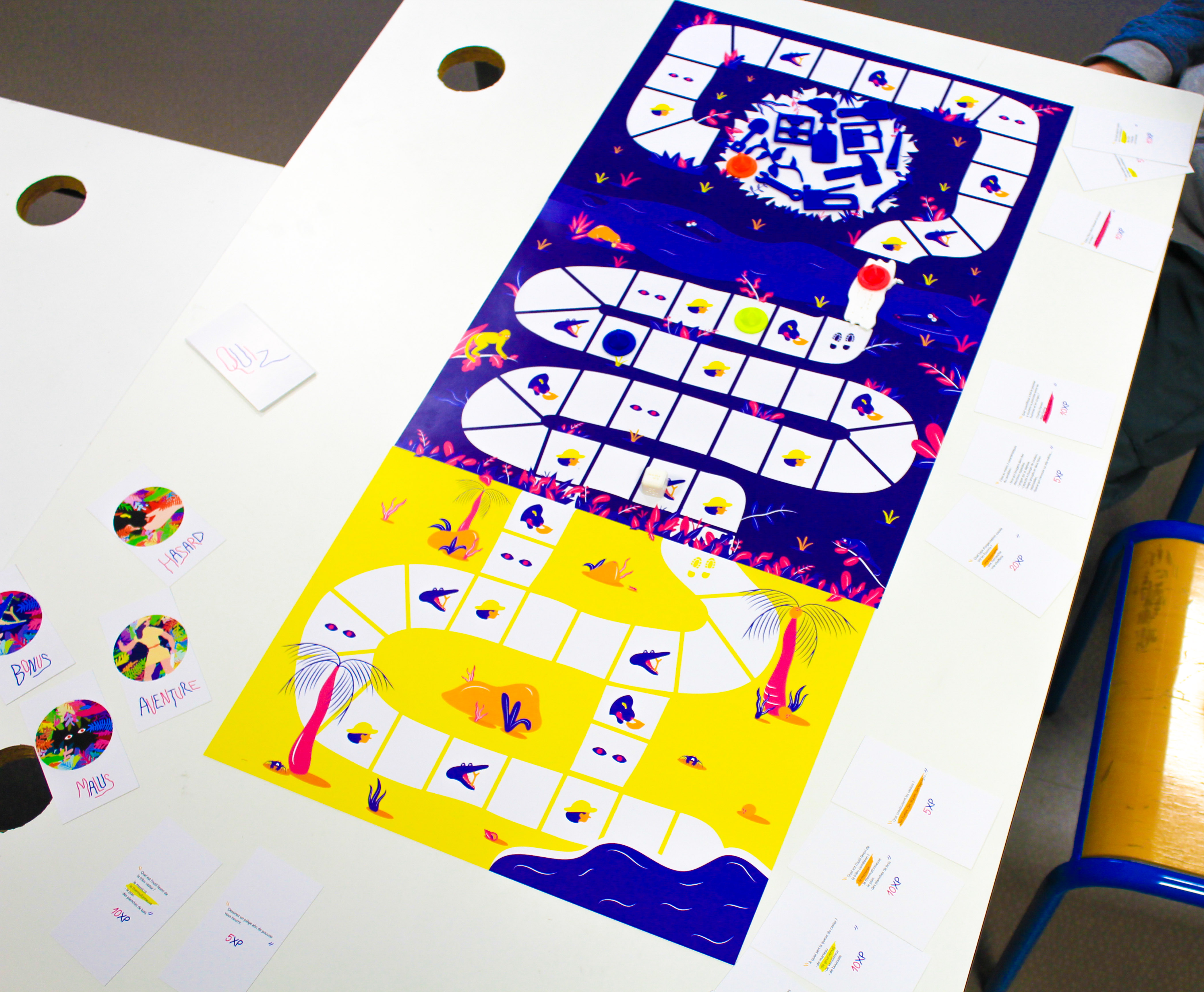 Le premier joueur qui arrive sur la dernière case des deux premiers plateaux, la Plage et la Jungle, doit chercher sur le plan l'outil qui lui permettra d'accéder au plateau suivant (le massicot pour passer de la Plage à la Jungle et le bout de bois pour aller de la Jungle à la Clairière). Les plateaux seront alors débloqués pour les autres joueurs, qui pourront ainsi y accéder.