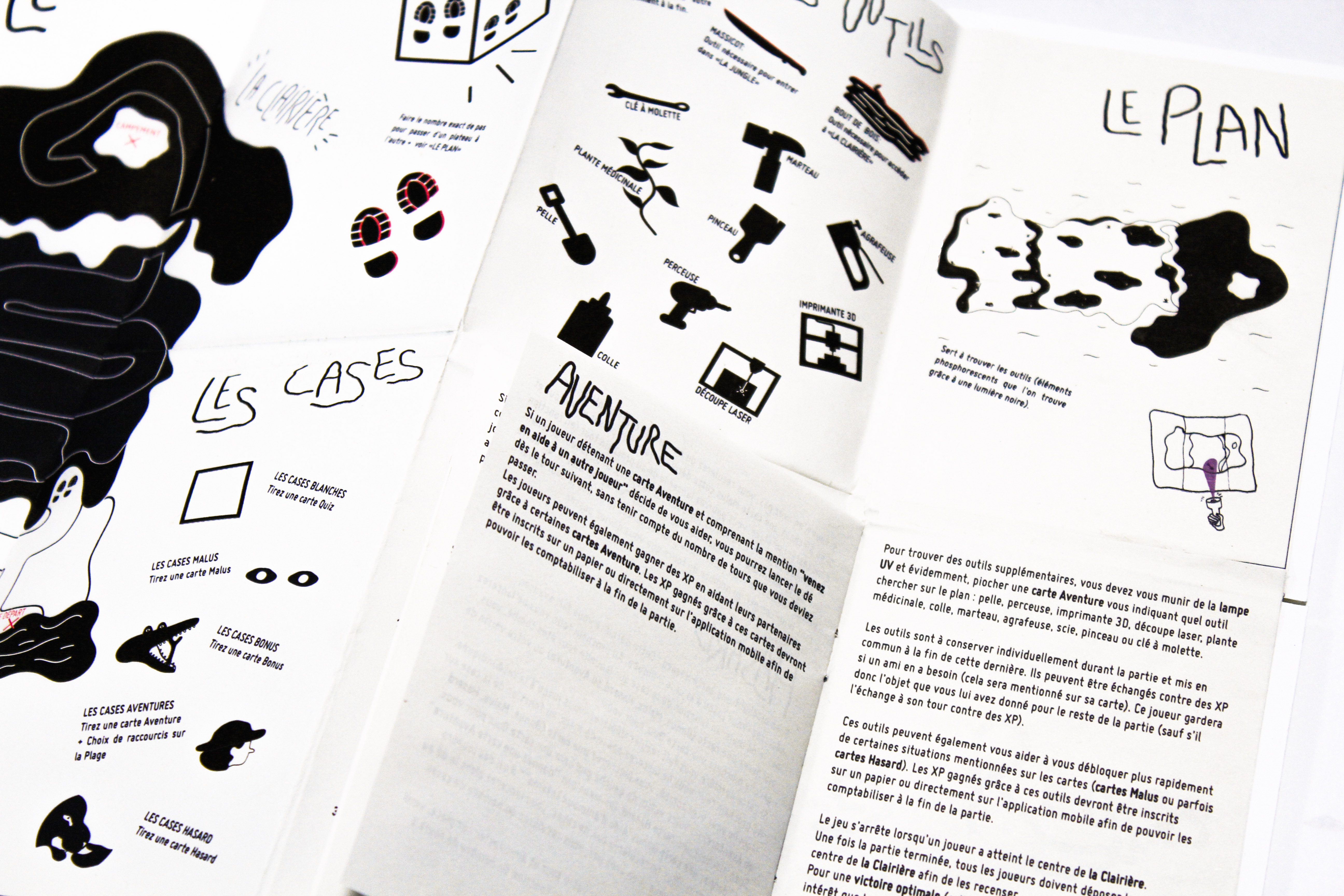 Pour trouver des outils supplémentaires, vous devez vous munir de la lampe UV et évidemment, piocher une carte Aventure vous indiquant quel outil chercher sur le plan : pelle, perceuse, imprimante 3D, découpe laser, plante médicinale, colle, marteau, agrafeuse, scie, pinceau ou clé à molette. Attention aux outils cassés !