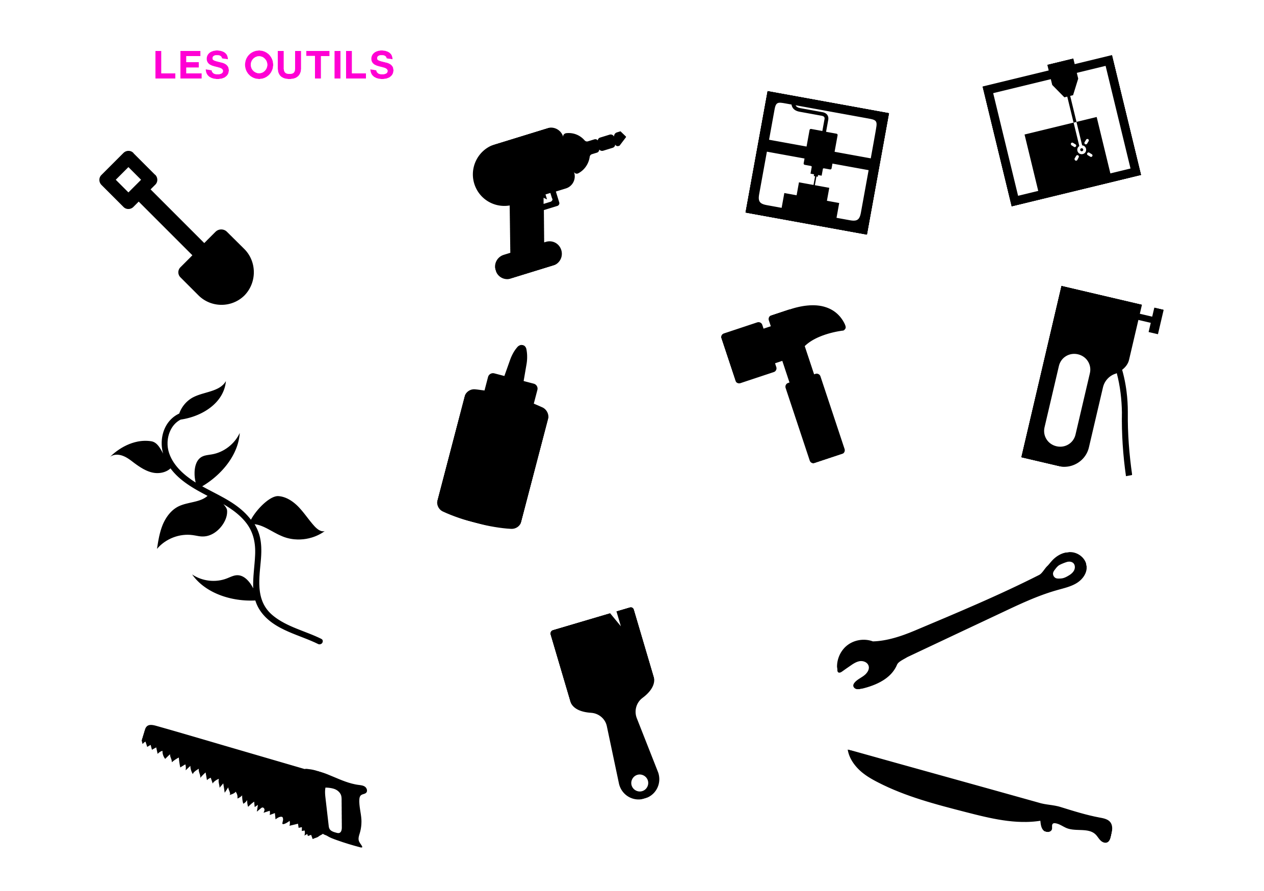 12 outils : pelle, perceuse, imprimante 3D, découpe laser, plante médicinale, colle, marteau, agrafeuse, scie, pinceau, clé à molette et massicot. Ainsi qu'un bout de bois.