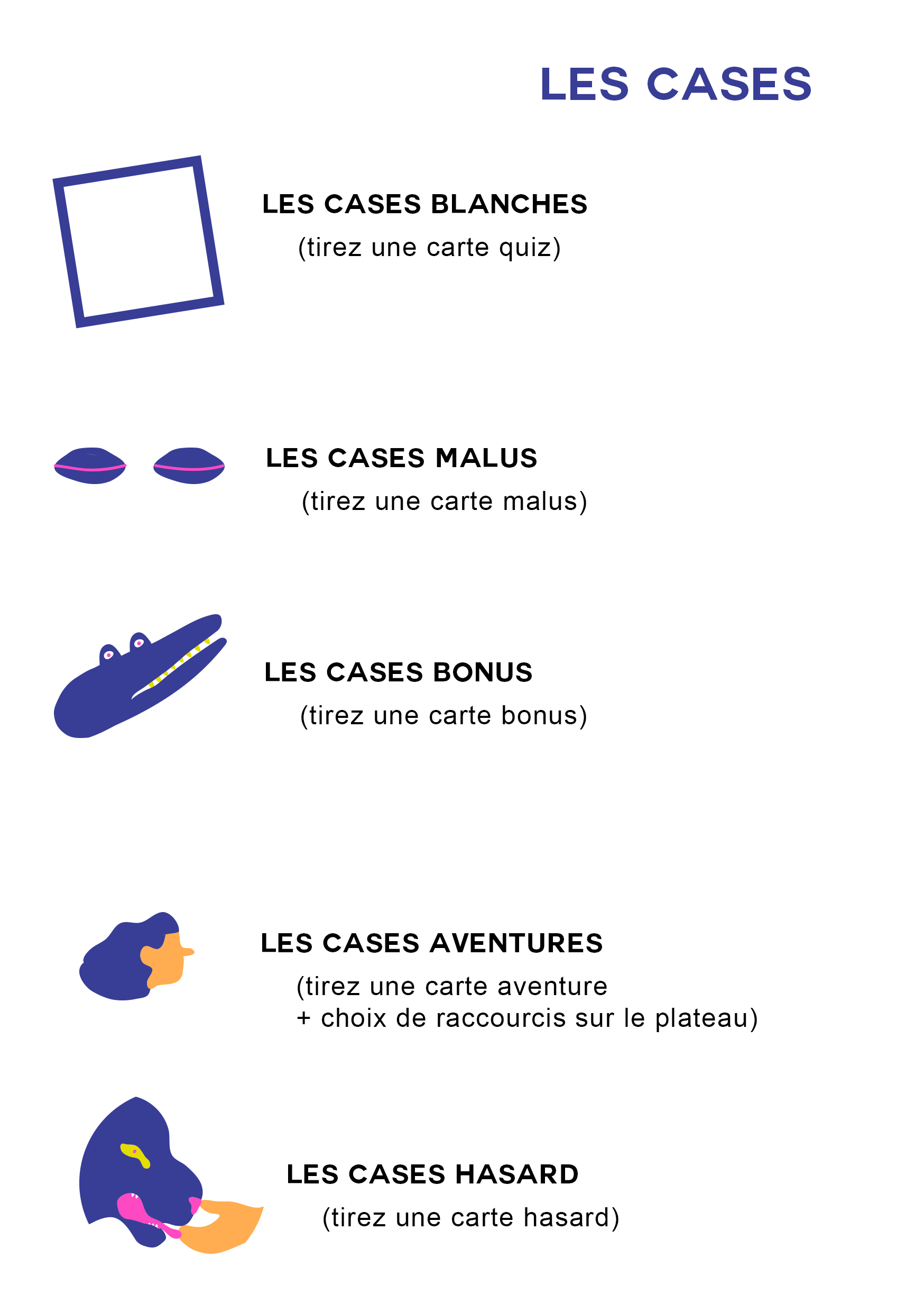 En lançant le dé, le joueur peut tomber sur 5 types de cases : Bonus, Malus, Hasard, Aventure ou Quiz. Ce sont ces cases qui détermineront l'avancée du joueur sur le plateau.