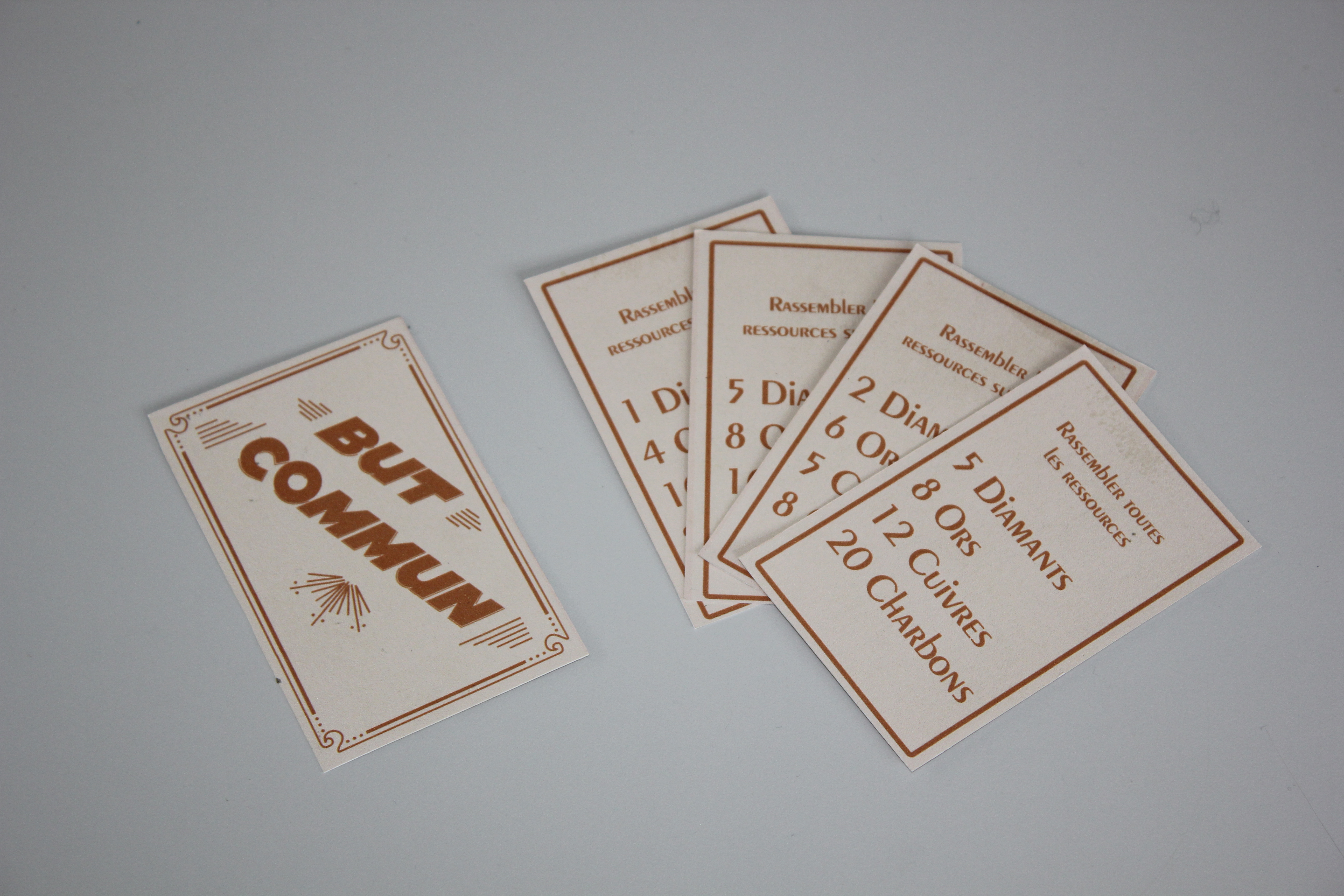 Un but commun doit obligatoirement être pioché en début de partie dans la pioche de cartes de buts communs, par un des joueur. Le but commun doit être accompli par tous les joueurs, en équipe. La partie se termine une fois que le but commun est accompli et que tous les joueurs sont sortie de la mine par le centre du plateau de jeu. Si un des joueurs ne participe pas à l'accomplissement du but commun, il est le perdant de la partie.