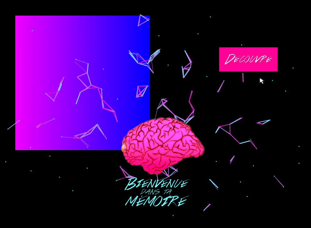 Pour réaliser ce projet, j'ai cherché sur openprocessing.org un scketch en rapport avec le cerveau qui me plaisait et j'ai trouvé "Neurons" de Carl Vitasa. Je l'ai donc modifié (couleurs des billes/traits/fond, taille des billes, épaisseur des traits, vitesse du déplacement, nombre de billes/traits,…), mais j'ai également rajouté des éléments tels que du texte, une image en dégradé, des photographies et un bouton. Lorsque vous déplacez votre curseur de souris sur le bouton “Découvre”, des photographies apparaissent aléatoirement sur le carré dégradé. J'ai voulu illustrer des souvenirs qui nous reviennent en mémoire comme des flashs.