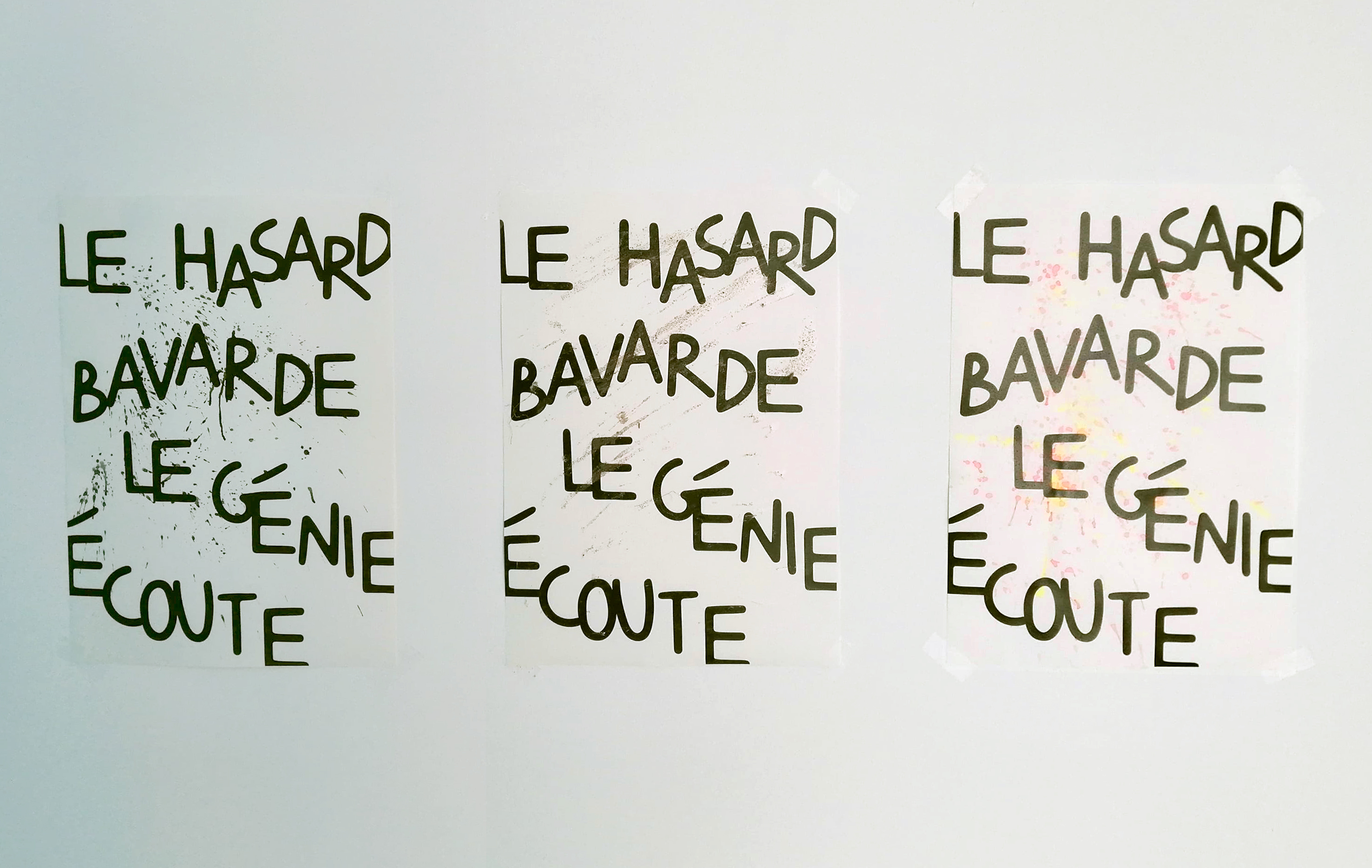 Pour ce projet, mon intention est de lier le hasard au vivant, qui est le thème principal de mon mémoire de DSAA. Dans le cadre de ce projet, le «vivant» se restreint aux 4 éléments. J’ai voulu voir comment chacun des éléments eau, feu, terre, air pouvait intervenir de façon hasardeuse avec un support imprimé. Quelles étaient les modifications apportées par l’élément sur le support.