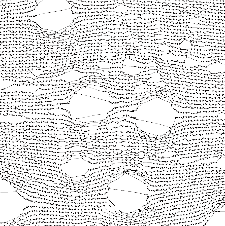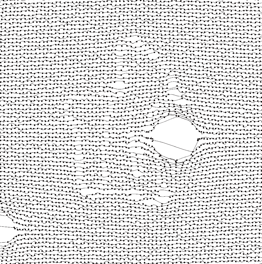 J'ai obtenu le résultat escompté (Muti : expliquer cette phrase qui arrive brutalement) et j'ai donc ajouté un bruitage de tissu qui se déchire pour un côté plus immersif. Le code dessine des lignes balisées de point noirs pouvant évoluer en fonction de comment est placé le curseur de la souris. Il simule le déchirement du tissu, c'est pour cela que ce programme processing correspond en tout point avec la thématique de mon projet de pratique plastique. Je voulais représenter l’altération suite au passage de quelque chose. Chaque fois que le programme est ouvert, l'altération n'est jamais la même. Nous sommes acteur de l'altération et nous pouvons décider de comment va s'étioler le tissage.
