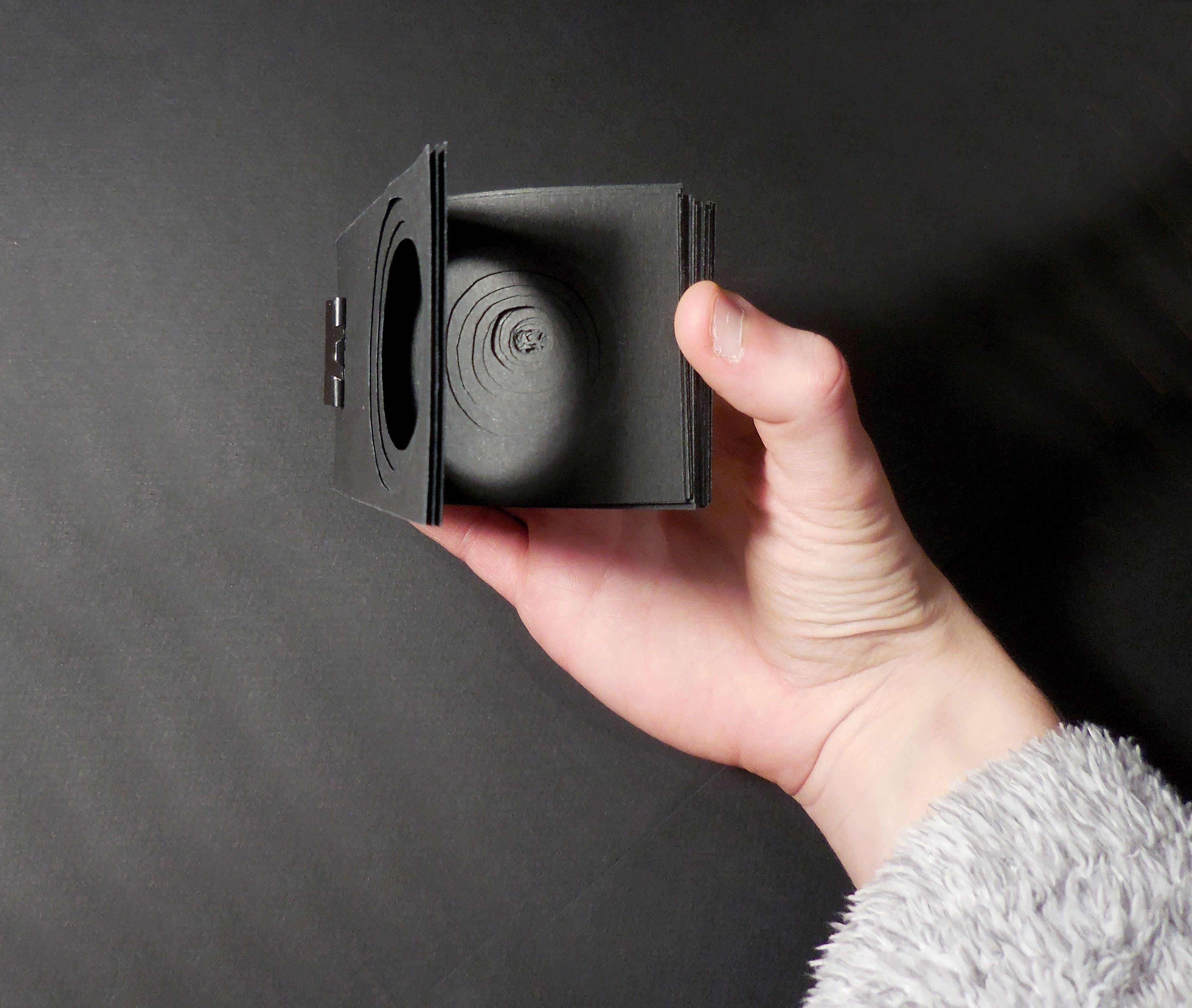 Pour symboliser l’immatérialité de ce temps de la réincarnation il m’a semblé logique de créer des formes non figuratives venant s’opposer aux formes concrètes que l’on a l’habitude de voir autour de nous durant les quatre premières saisons. J’ai donné à ces formes l’apparence de trous dans les différentes pages des flipbooks de façon à représenter l’absence, le vide, le néant de la mort. Dans la même idée j’ai choisi de travailler uniquement avec des matériaux noirs. Dans les trois derniers flipbooks j’ai ajouté du crayon de papier, se voyant à la lumière si on a la bonne inclinaison, puis du crayon blanc bien lisible de façon à apporter progressivement de la matérialité aux pages c’est à dire de passer de l’absence de matière à une matière fragile puis bien présente.