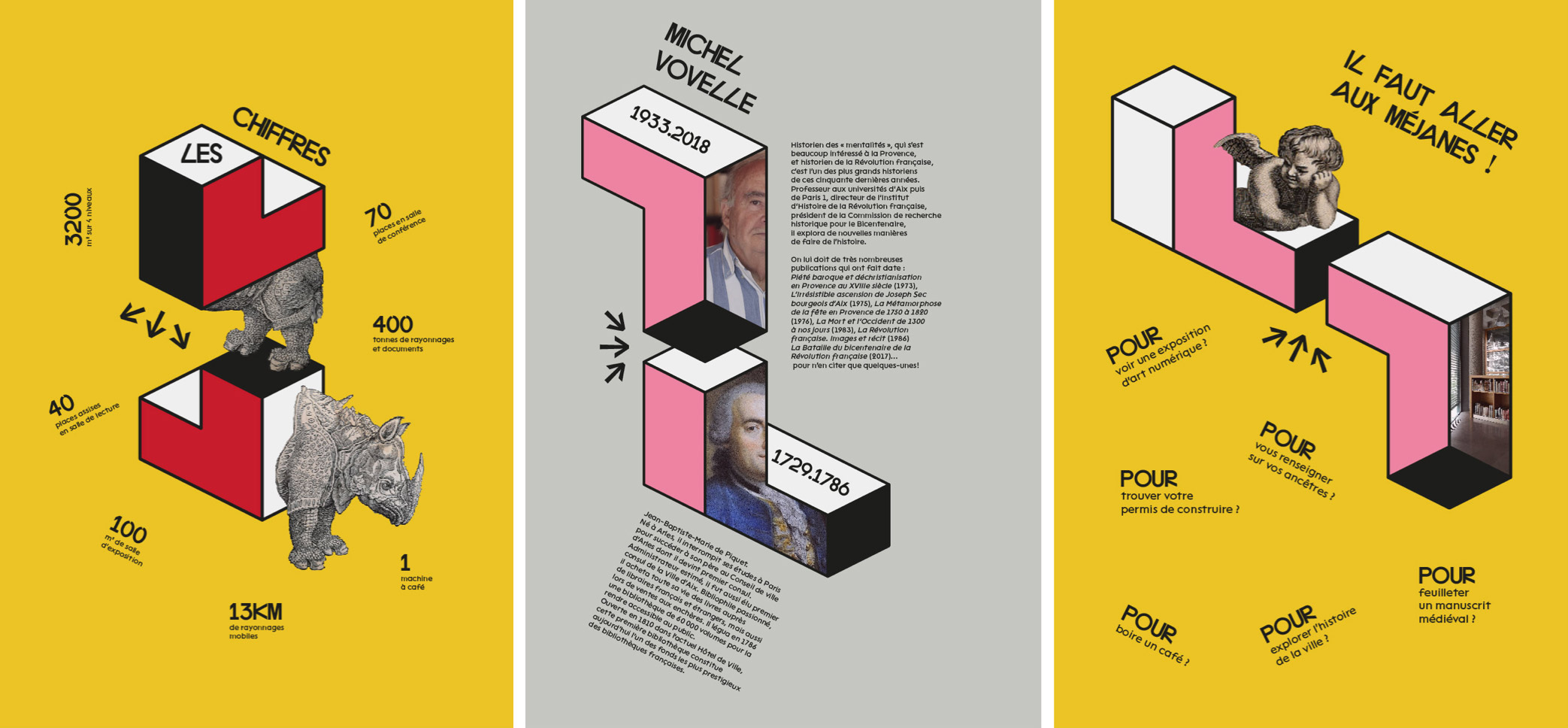 Proposition de signalétique événementielle pour l'inauguration des Méjanes à Aix.