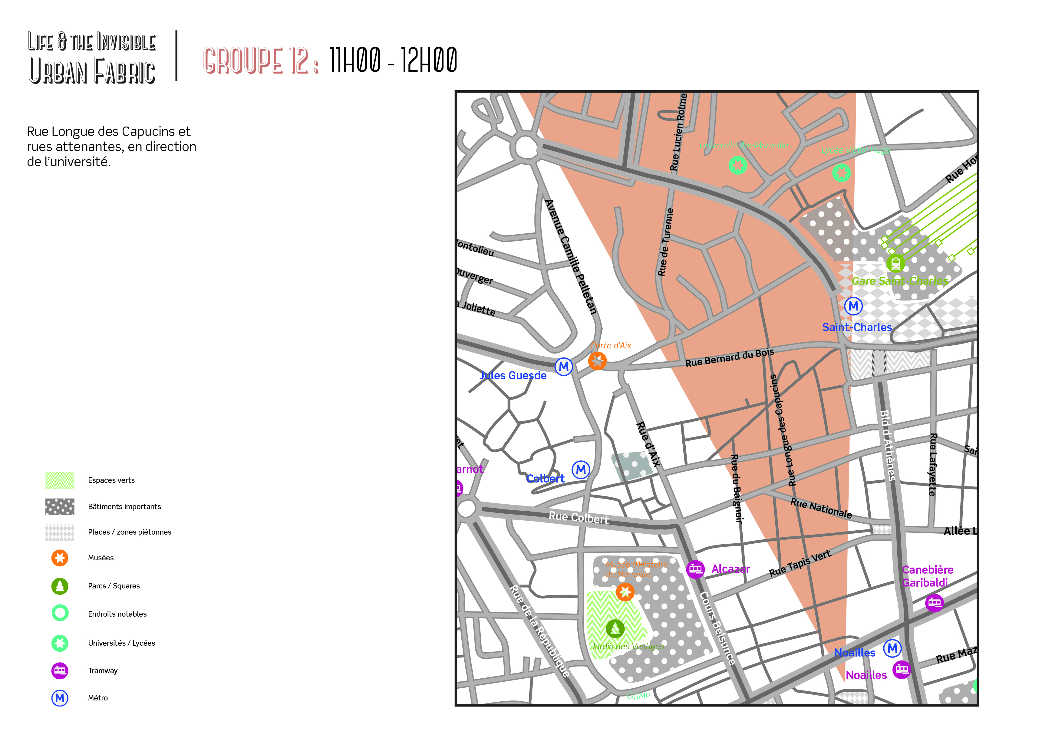 En faisant la “Smellwalk”, nous avons fait un inventaire des odeurs présentes dans ce quartier. Nous les avons ensuite classées suivant 5 catégories : les personnes, la nourriture, les zones de travaux, les odeurs artificielles et la poussière. Nous avons organisé notre “Smellmap” suivant des zones d'odeurs. En effet, les odeurs étaient concentrées sur certains points de la carte, par exemple sur la longue rue des Capucins et autour de la Gare Saint Charles. Ainsi, nous avons pris le partis de laisser de côté la représentation des rues, des places, des avenues en nous concentrons uniquement sur les odeurs qui viennent dessiner cette “Smellmap”.