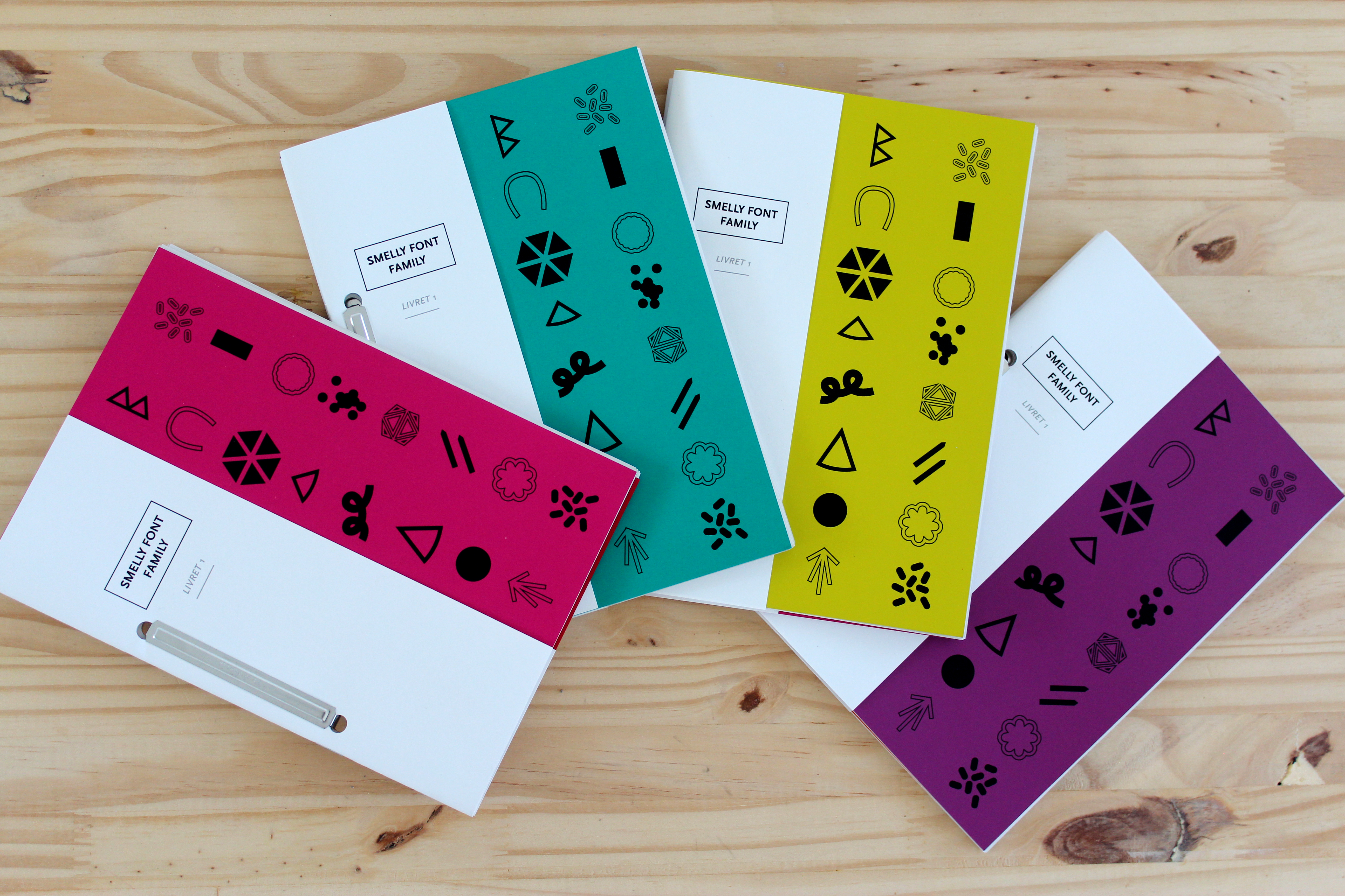 En vue de la constitution des maquettes, une collecte de formes a été engagée par les étudiants. J'ai décidé de travailler à partir de cette collecte, laquelle propose des équivalents visuels pour procéder à un travail méthodique de typologie de ces formes. Chaque type de forme a été associée à l'une des dix grandes catégories d’odeurs mises en lumière par le scientifique Jason Castro et son équipe (doux, boisé, mentholé, fruité [non-citron], fragrance, chimique, pop-corn, citron, écœurant [âcre] et écœurant [putride]). La typographie est configurée avec les touches du clavier. On trouve trois graisses différentes pour l’intensité de l’odeur (light pour les odeurs faibles, bold pour les odeurs fortes, et regular pour les odeurs medium). La durée de l’odeur se définit par sa taille et est configurée par la touche MAJ.