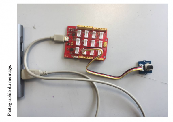 Le montage est très simple, il suffit de brancher à l’aide d’un port usb la carte seeeduino à ton ordinateur et de brancher sur une sortie analogique choisit et précisé sur Arduino le potentio- mètre