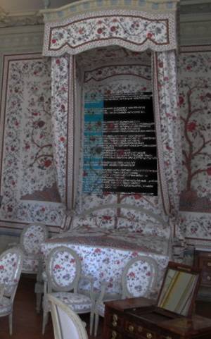 Située sur la façade nord, cette chambre offre des motifs floraux et notamment celui de l’arbre de vie: un arbre avec des branches tordues et fleuries émergeant d'un petit monticule et encadré de deux bordures, une grande et une petite, également fleuries. Cette chambre rassemble le mobilier le plus précieux du château et possède de nombreux textiles pour décliner ce motifs. Le motif va ainsi apparaître autant sur les murs de cet appartement que sur les rideaux, les sièges, les canapés ,fauteuils et coussins de celui-ci. Ainsi, pour permettre cette déclinaison, une grande richesse et diversité techniques a été mise en oeuvre: la broderie, le tissage et l’indienne, c’est à dire du tissus peint . Et c’est en effectuant mes recherches sur ces motifs et notamment sur les techniques de création de ces motifs que je me suis rendue compte que l’ensemble du travail des textiles de cette pièce n’était pas d’origine.