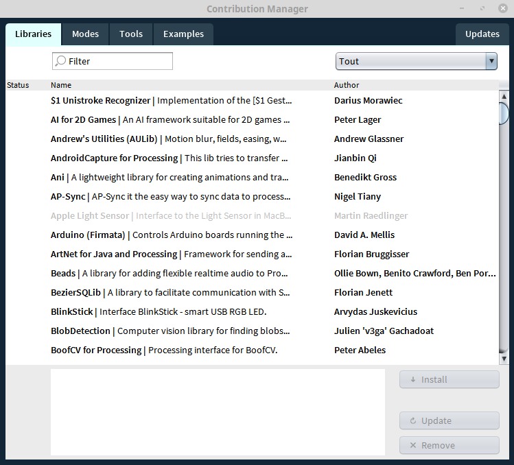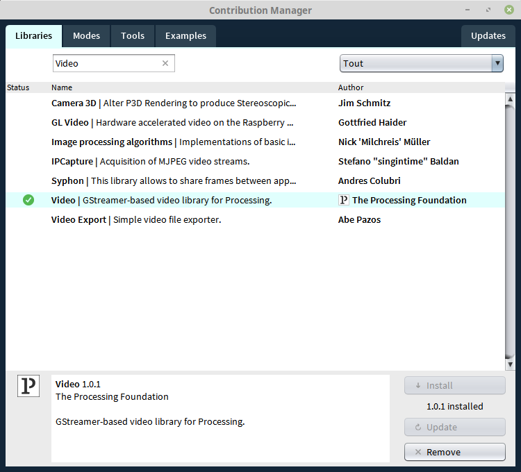 4. Si elle ne sont pas déjà installée sur votre machine, télécharger et installer les librairies suivantes: Video et Sound. Pour cela aller dans Sketch > Importer une librairie > Ajouter une librairie. La fenêtre suivant s'ouvre :
