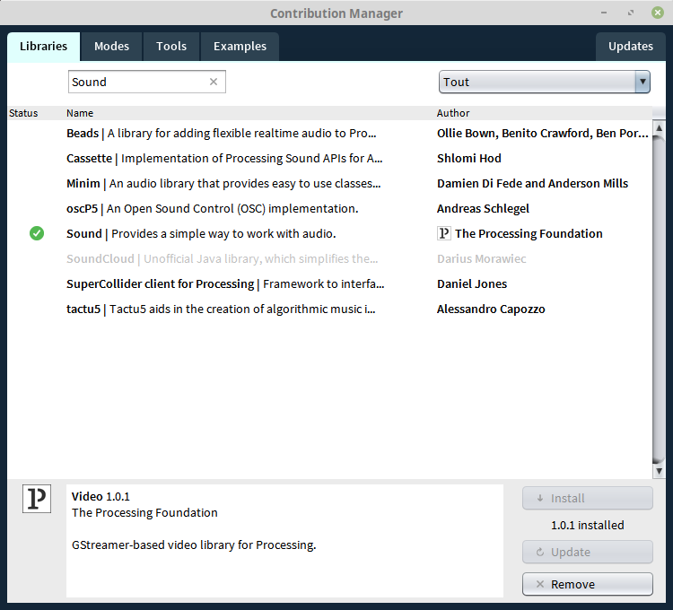 6. Faire de même pour l'installation de la librairie “Sound” :