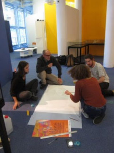 1. Lorsque le programme “Affiche_interactive.pde” est affiché dans l'interface de développement de Processing, appuyer sur la flèche (bouton “play”): une fenêtre noire apparaît.