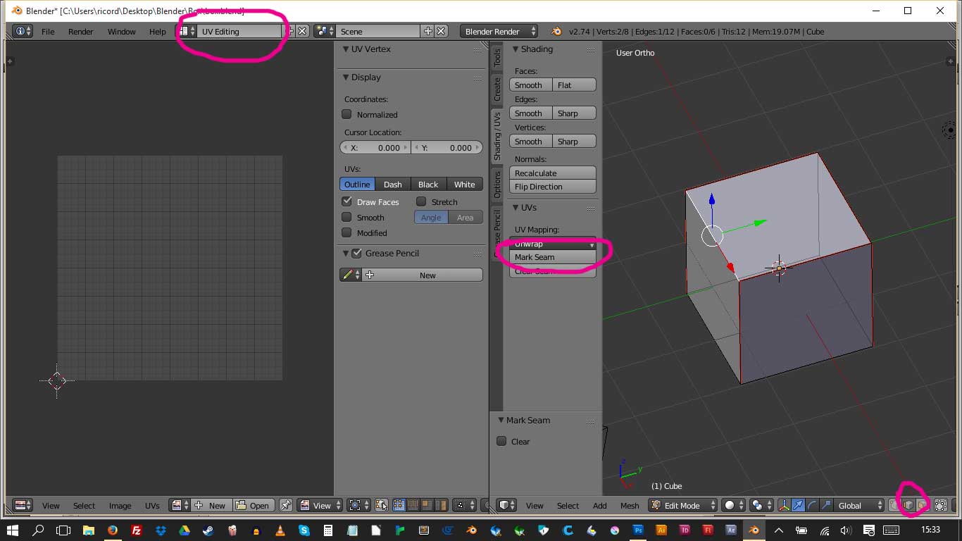 Sélectionner la configuration UV Editing permettant de déplier le cube.
