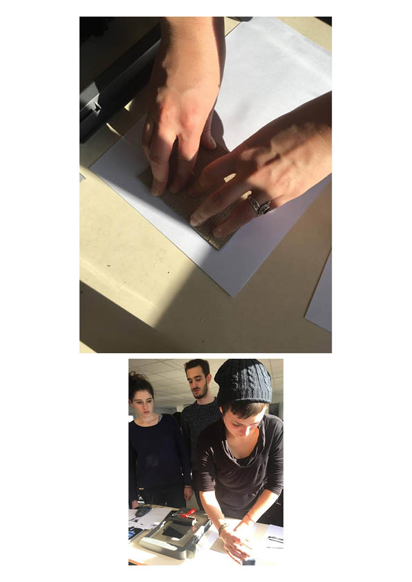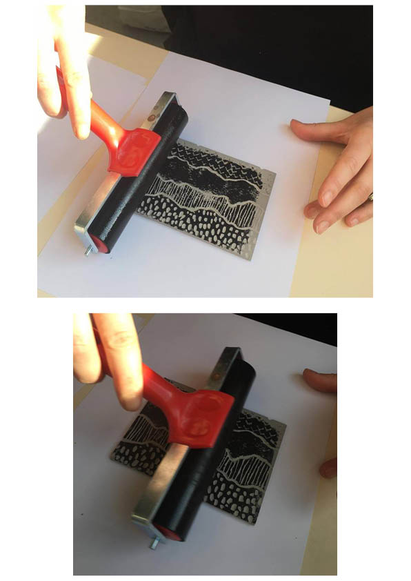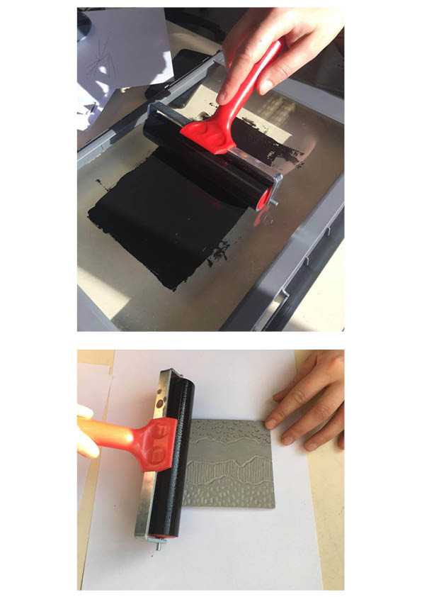 Encrage du rouleau (bien l'encrer sur la plaque en faisant des mouvements horizontaux et verticaux pour que la surface du rouleau soit encrée de manière homogène).
