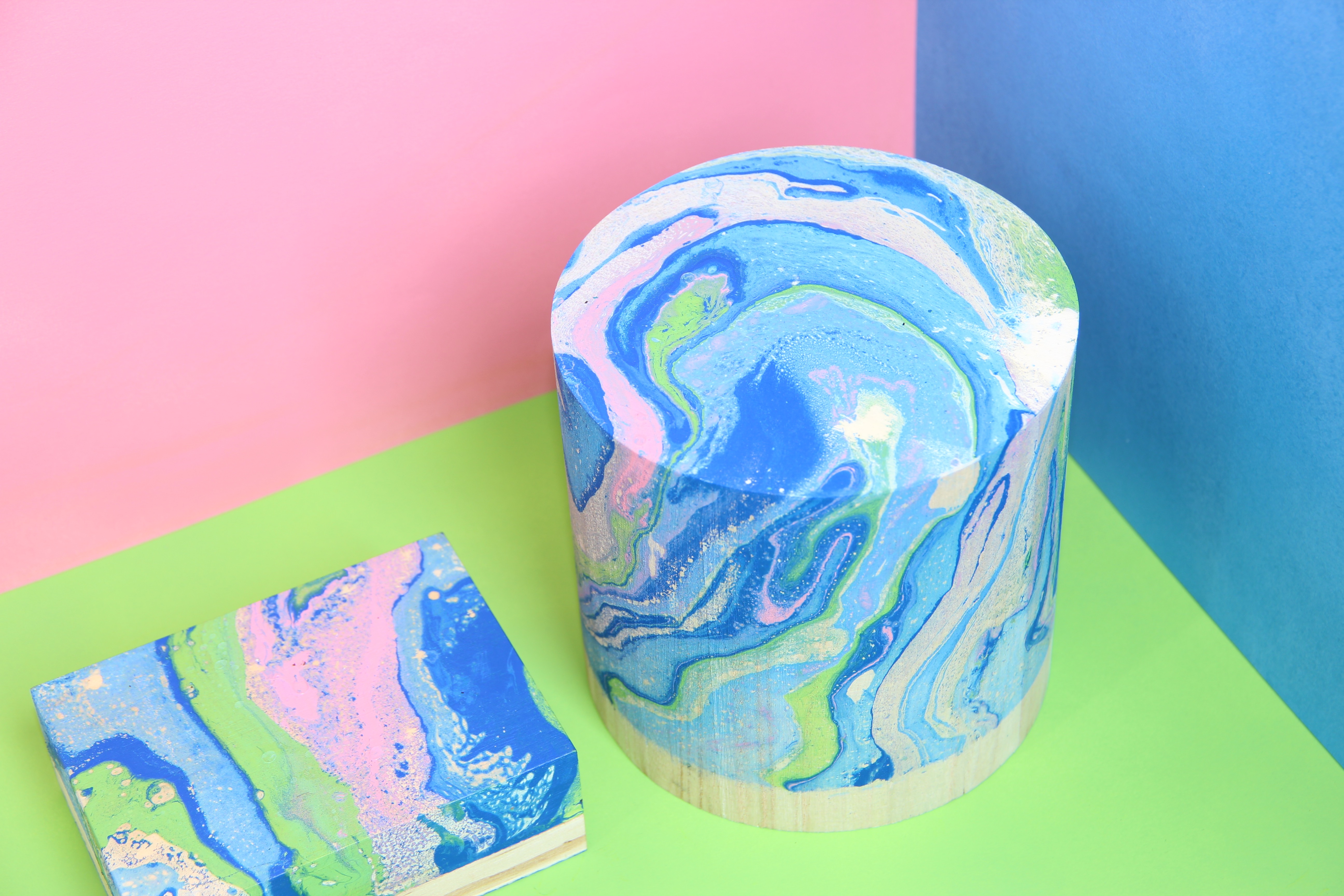 Technique pour marbrer des objets en bois, certainement aussi en carton (et testé aussi sur le verre mais le rendu n'est pas toujours très propre).
