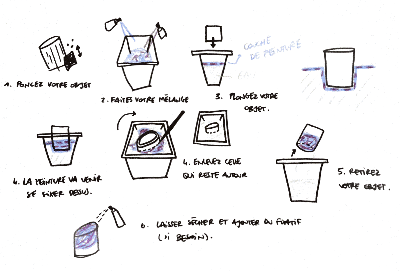 >Poncez légèrement votre objet en bois et quand votre motif est défini (n'attendez pas trop longtemps car la peinture à la surface peut se solidifier) plongez-le dans l'eau jusqu'où vous voulez. Si il reste de la peinture autour enlevez-là à l'aide d'une baguette en laissant l'objet sous l'eau. Car si vous remontez trop vite le reste de peinture va se fixer par dessus le motif qui vient déjà de se poser!