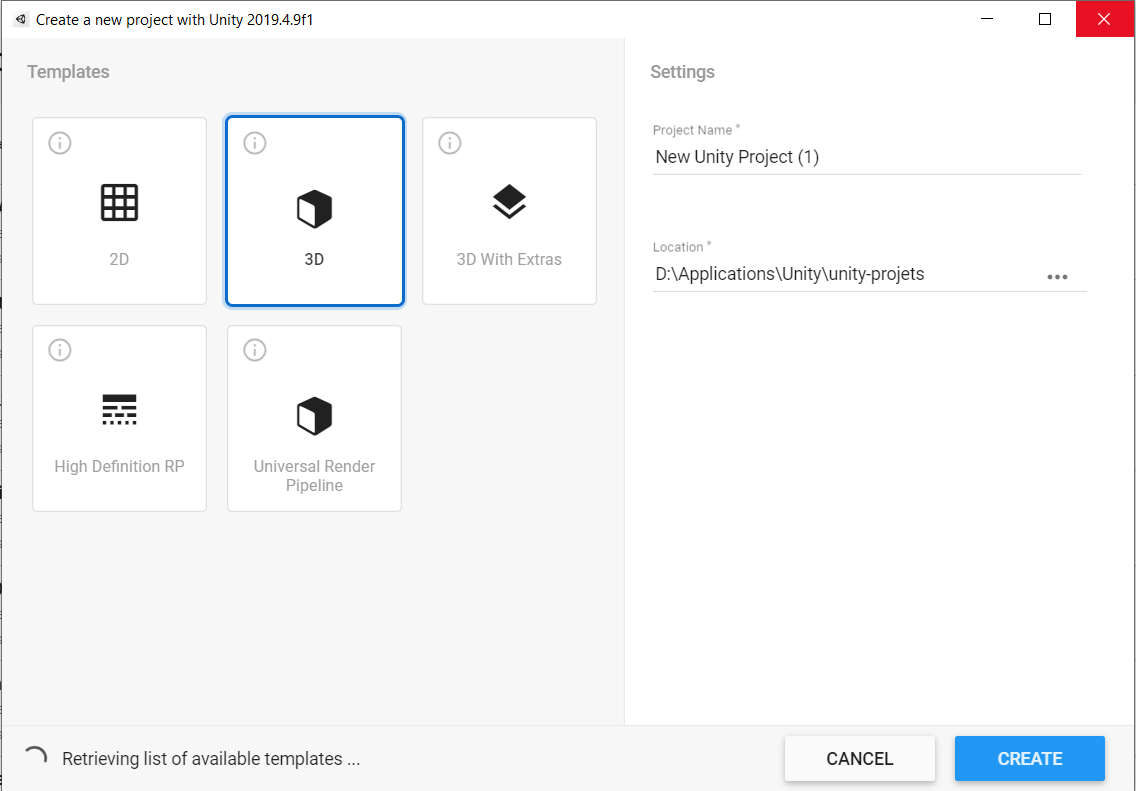 • Depuis le Hub ou directement depuis Unity, créer un projet 3D