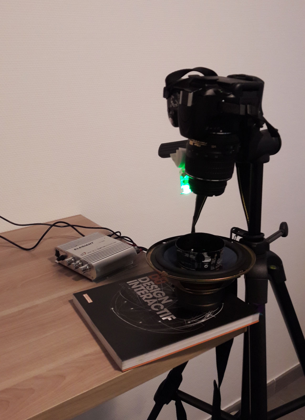 Voici un exemple de montage réalisé par mes soins, utilisant de l'encre de chine comme liquide et accompagné d'une vidéo illustrant le résultat. Pour ce qui est de la source lumineuse, ce n'est rien d'autre qu'une petite led que l'on peut trouvée dans des boutiques comme Flying Tiger Copenhagen, atténuée par du scotch pour ne pas qu'il illumine trop le récipient une fois dans le noir.