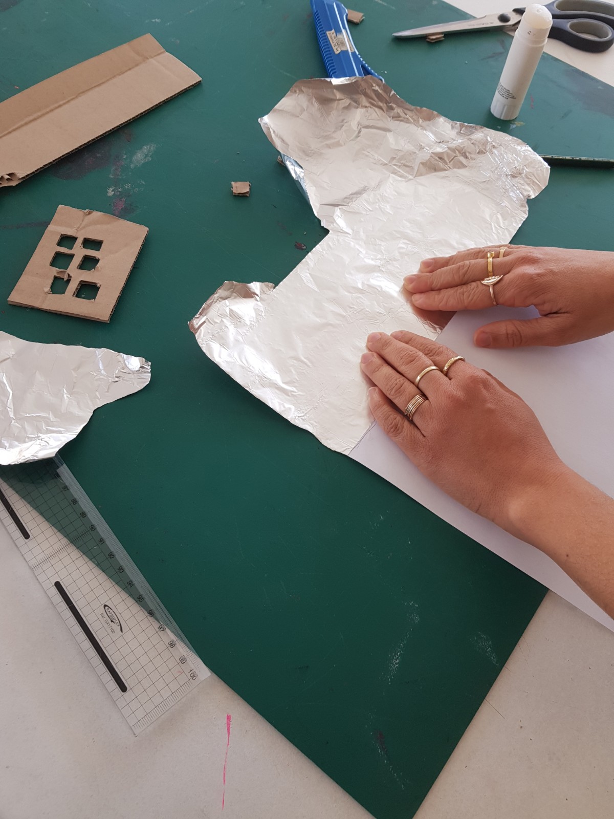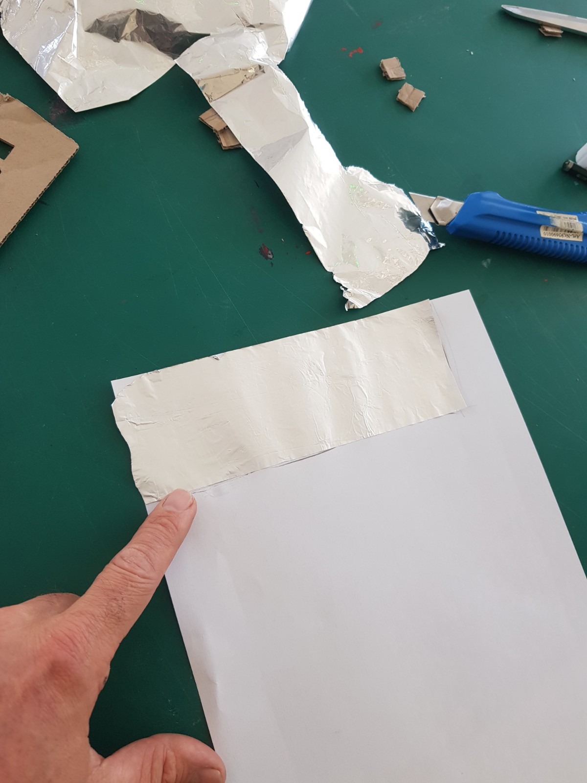 Il faut tout d'abord couper le carton ou la mousse comme un damier, puis coller de chaque côté une feuille d'alu tout en laissant un rebord plié de chaque côté pour pouvoir ensuite y mettre les branchements. Par dessus une des feuilles d'alu, il faut venir coller le visuel de la signalétique.
