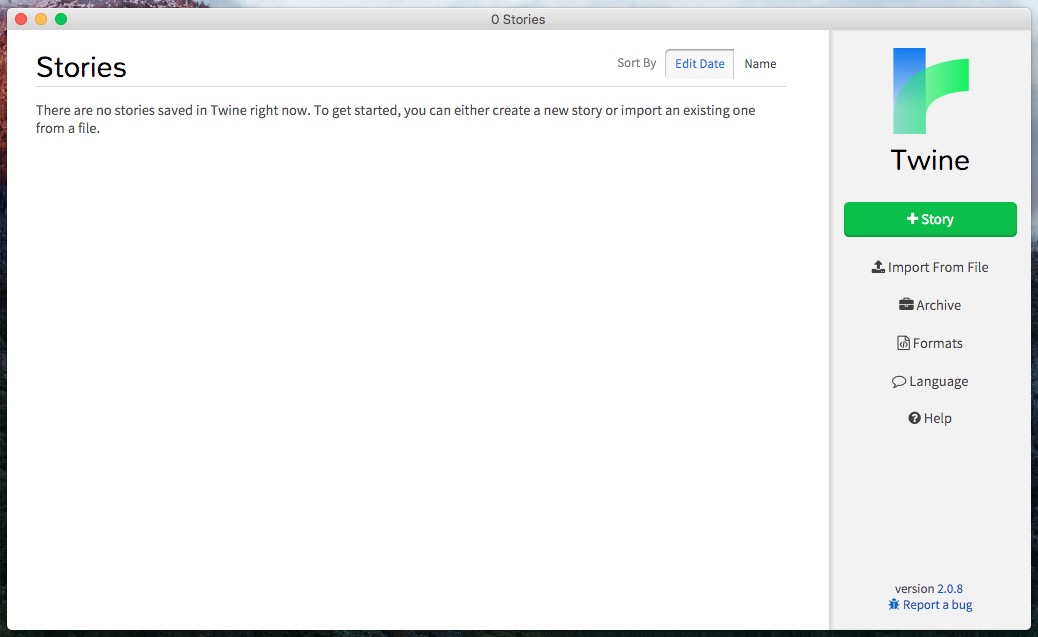 Twine est disponible sur Windows et Mac OS X, mais on peut également l'utiliser en ligne. Installez le logiciel Twine depuis le site officiel.