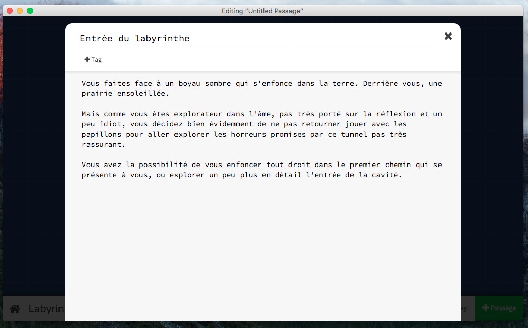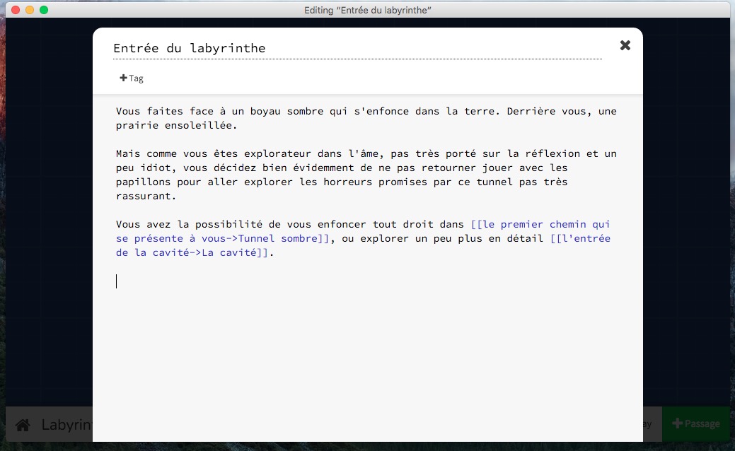 En double-cliquant sur la tuile, on accède à la fenêtre d'édition qui nous permet de la titrer et de lui ajouter un texte de la narration. Elle nous indique également la syntaxe à utiliser afin de rendre l'histoire interactive.