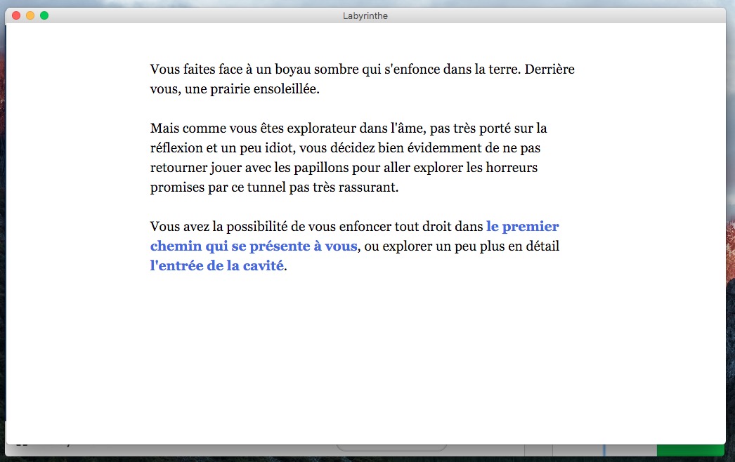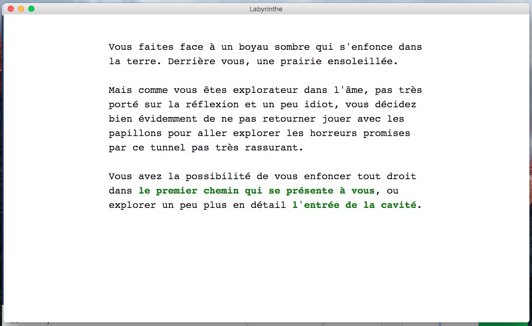 Il est maintenant temps de créer les étapes suivantes de notre histoire : il est nécessaire d'indiquer les extraits textuels qui porteront les liens qui permettront de choisir la suite de la narration. Pour cela, il faut utiliser les crochets de cette façon :