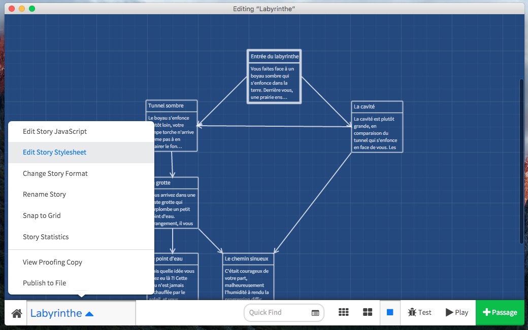Twine offre la possibilité de personnaliser les sheets CSS et Javascript de notre aventure. Pour cela, il faut se rendre (comme pour exporter un fichier HTML) dans le menu déroulant accessible depuis le nom de notre aventure, et sélectionner par exemple “Edit Story Stylesheet” (édition du CSS).
