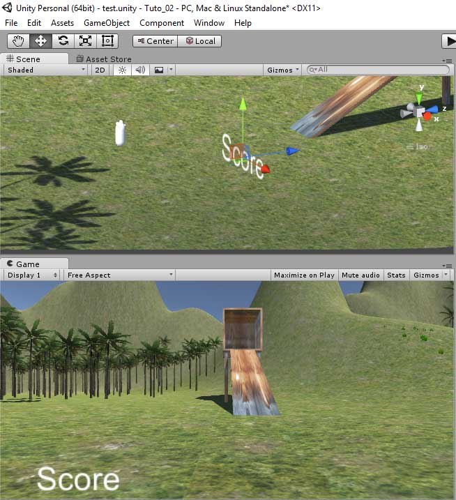 L'objet 3D Text s'affiche à l'écran, renommez-le (F2 ou Inspector) “Score” par exemple. Glissez-le dans la Main Camera de l'objet First Person Controller afin qu'il soit “enfant” de celle-ci. Modifiez sa position dans la fenêtre preview et modifiez ses attributs dans l'Inspector.